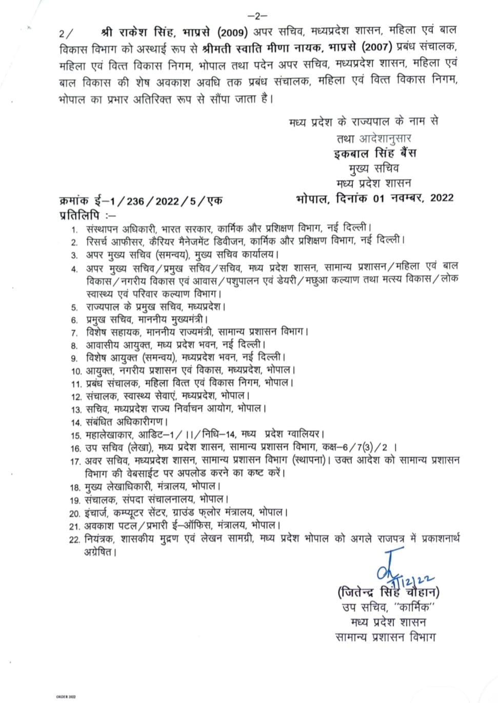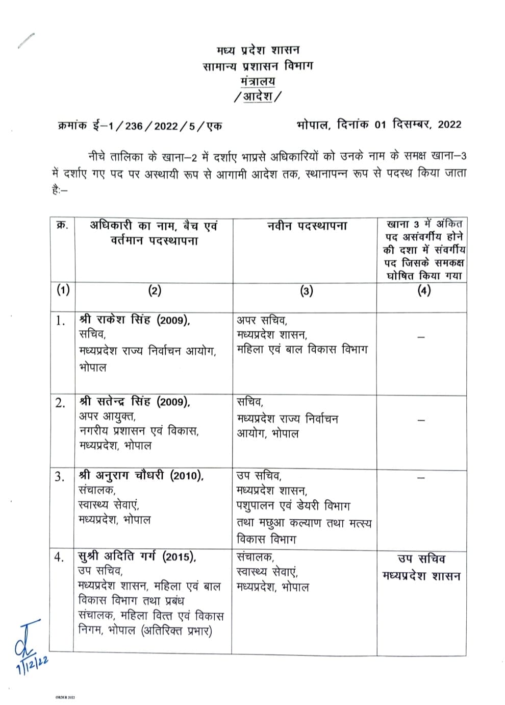 मंत्रालय से जारी तबादला सूची में 2009 बैच के IAS अधिकारी राकेश सिंह और सतेन्द्र सिंह एवं 2010 बैच के IAS अधिकारी अनुराग चौधरी और 2015 की IAS अधिकारी अदिति गर्ग के नाम शामिल हैं। राज्य शासन ने राकेश सिंह की सचिव मप्र राज्य निर्वाचन योग के दायित्व से मुक्त करते हुए अपर सचिव महिला एवं बाल विकास के पद पर पदाथ किया है, शासन ने राकेश सिंह को महिला एवं वित्त विकास निगम की प्रबंध संचालक स्वाति मीणा नायक के अवकाश से वापस लौटने तक इस पद का भी अतिरिक्त प्रभार सौंपा है ।