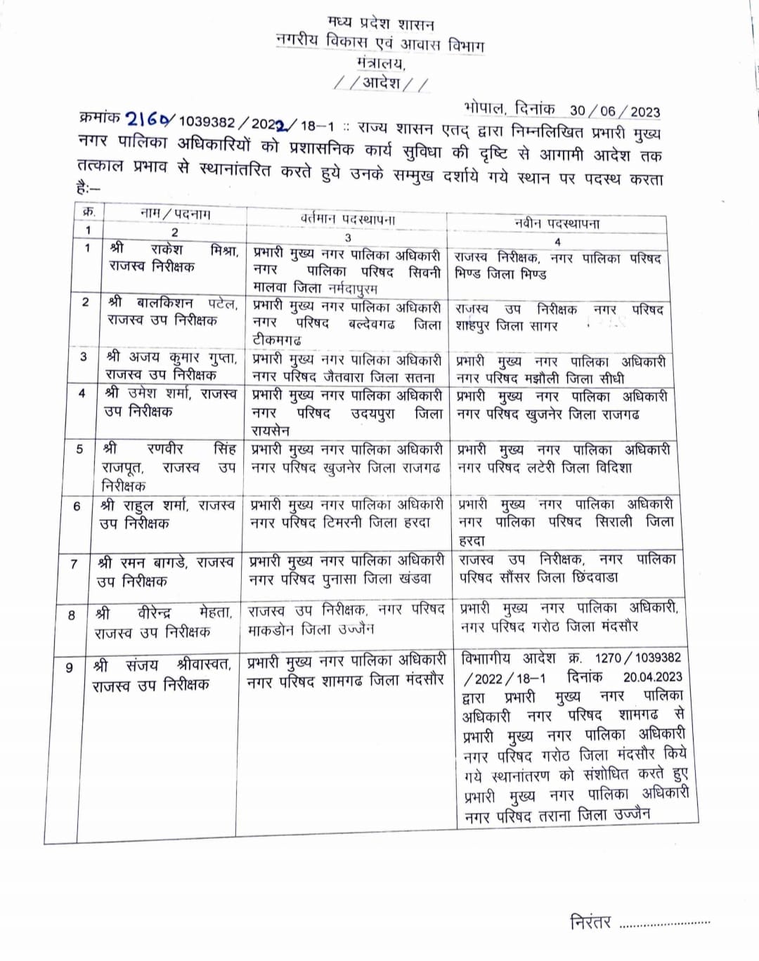 नगरीय विकास एवं आवास विभाग ने आज जो तबादला सूची जारी की है उसमें 10 अधिकारियों के नाम हैं जिन्हें इधर से उधर किया गया है।