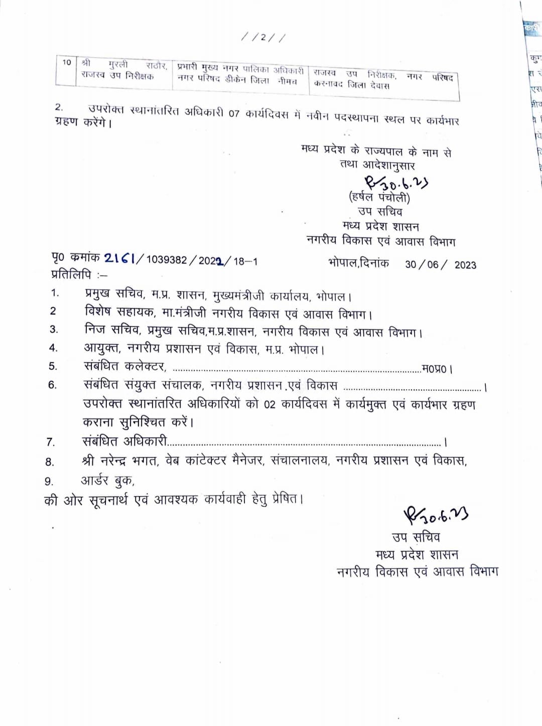 MP Transfer : मप्र में इस समय तबादलों का क्रम जारी है, शासन के विभाग अपने अधिकारीयों और कर्मचारियों के तबादला आदेश जारी कर रहे हैं, इसी क्रम में आज नगरीय विकास एवं आवास विभाग ने नगर पालिका के सीएमओ की तबादला सूची जारी की है।