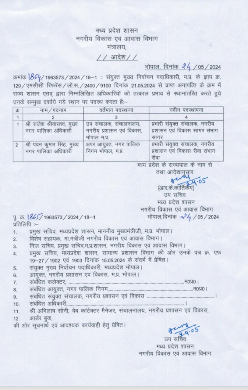 नगरीय विकास एवं आवास विभाग द्वारा जारी किये गये तबादला आदेश में संचालनालय भोपाल में पदस्थ उप संचालक राजेश श्रीवास्तव को प्रभारी संयुक्त संचालक नगरीय प्रशासन एवं विकास सागर संभाग सागर पदस्थ किया है वहीं भोपाल नगर निगम के अपर आयुक्त पवन कुमार सिंह को प्रभारी संयुक्त संचालक रीवा संभाग रीवा पदस्थ किया है। दोनों ही अधिकारियों के मूल पद मुख्य नगर पालिका अधिकारी हैं।
