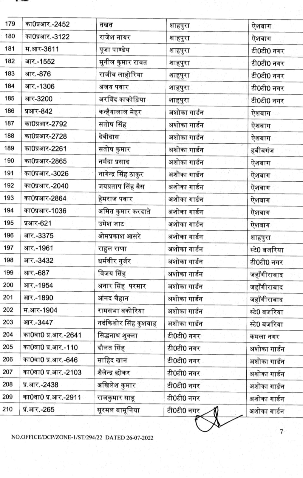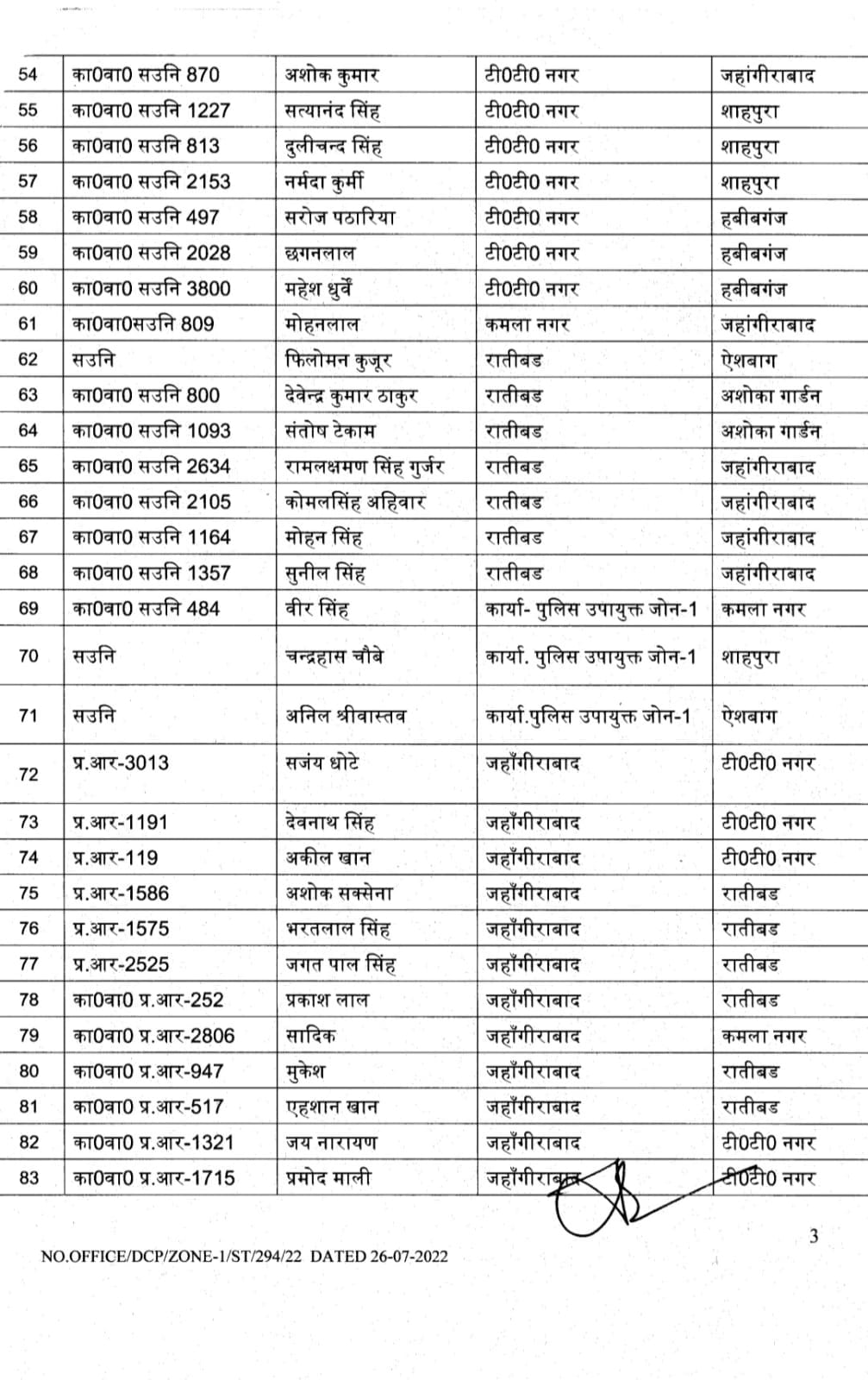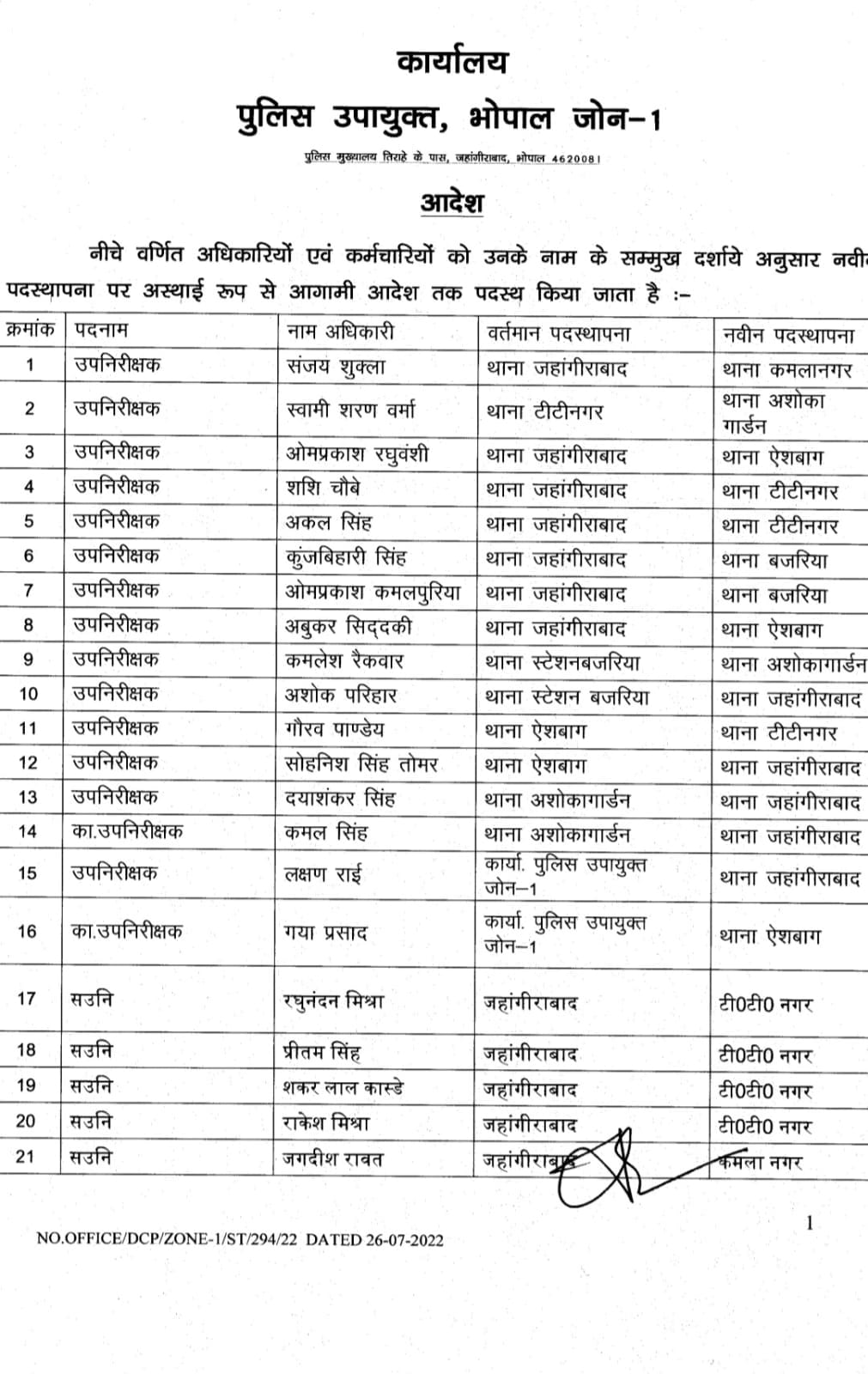 भोपाल , डेस्क रिपोर्ट। मप्र में तबादलों (MP Transfer) का क्रम अभी जारी है। आज भोपाल जोन -1 के पुलिस उपायुक्त ने शासकीय कार्य की सुविधा की दृष्टि से अधिकारियों – कर्मचारियों के थोकबंद तबादले (MP Police Transfer) किये हैं। पुलिस उपायुक्त साईं कृष्णा के हस्ताक्षर से इस तबादला सूची में 262 पुलिस अधिकारियों- कर्मचारियों के नाम शामिल हैं।