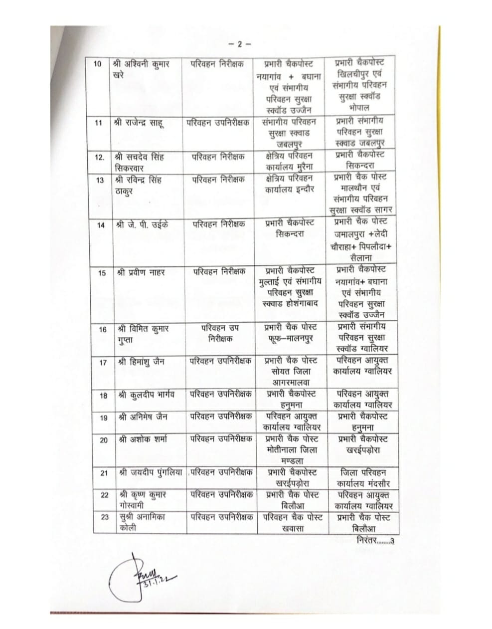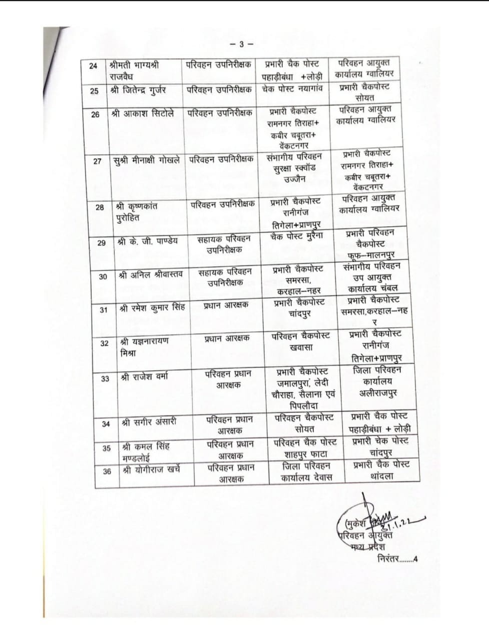 भोपाल, डेस्क रिपोर्ट। मध्य प्रदेश में तबादलों (MP Transfer) का दौर जारी है। मध्य प्रदेश शासन के परिवहन विभाग ने (MP Transport Department) आज 31 जनवरी 2022 को अपने विभाग का तबादला आदेश जारी किया है। परिवहन विभाग के तबादला (Transfers in MP Transport Department) आदेश में 36 अधिकारी-कर्मचारी प्रभावित हुए हैं। देखें पूरी सूची ….