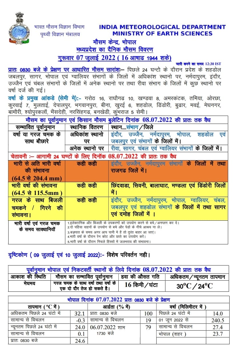 मप्र मौसम विभाग (IMD) ने आज गुरुवार 7 जुलाई को जारी अपनी दैनिक रिपोर्ट (MP Weather Daily Report) में मप्र के पिछले 24 घंटे और आने वाले 24 घंटे के मौसम की जानकारी दी है। मौसम विभाग ने मानसून की सक्रियता को देखते हुए इंदौर, उज्जैन, नर्मदापुरम, भोपाल, शहडोल, जबलपुर, रीवा, सागर, चम्बल एवं ग्वालियर संभाग के जिलों में बारिश और गरज चमक के साथ बौछारें गिरने की सम्भावना (MP Weather Forecast) जताई है।