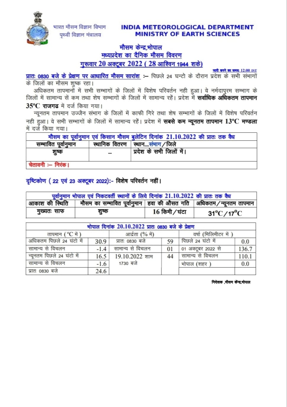 एमपी मौसम विभाग (MP Weather Update) ने अगले चार दिनों तक मौसम के शुष्क रहने के आसार जताये हैं। हालाँकि पिछले दिनों जारी पूर्वानुमान (MP Weather Forecast) के मुताबिक 23 और 24 अक्टूबर के बाद शहडोल संभाग के साथ बैतूल, हरदा, छिंदवाड़ा, मंडला, सिवनी और बुरहानपुर में ठंड का असर देखने को मिल सकता है।