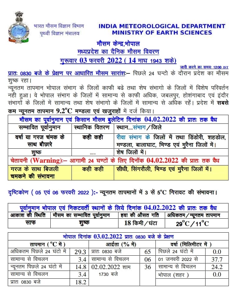 भोपाल, डेस्क रिपोर्ट। पश्चिमी विक्षोभ के एक्टिव होने से मध्य प्रदेश का मौसम (MP Weather Update Today) बदल रहा है। एमपी मौसम विभाग (MP Weather Department) के मुताबिक आने वाले दिनों में न्यूनतम तापमान में 3 से 5 डिग्री सेल्सियस की गिरावट की सम्भावना है। मौसम विभाग ने आने वाले 24 घंटों में प्रदेश में कहीं कहीं बारिश के आसार और बिजली चमकने का अलर्ट घोषित किया है।