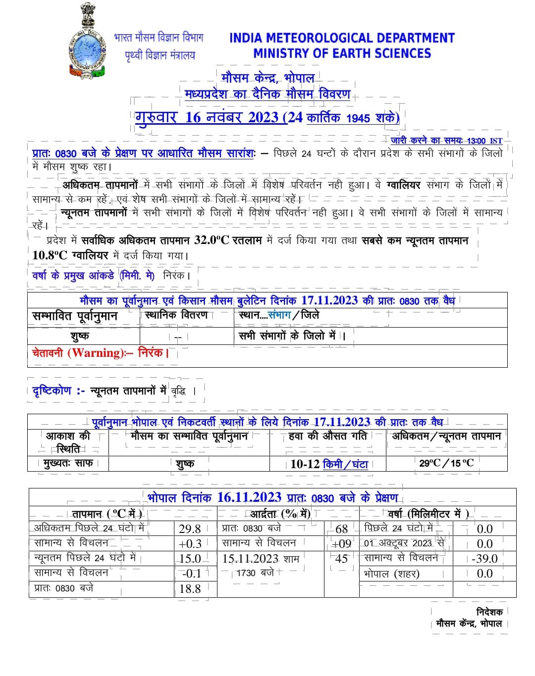 MP Weather Update Today 16 November 2023 : मध्य प्रदेश के मौसम ने बदलाव का दौर जारी है, रातें ठंडी होने लगी है और दिन में भी सर्दी का अहसास होने लगा है, पिछले दिनों पहाड़ी क्षेत्रों में हुई बर्फ़बारी का असर उत्तर भारत के राज्यों में दिखाई देने लगा है, एमपी मौसम विभाग का अनुमान है कि अभी कुछ दिनों तक ऐसा ही मौसम रहने वाला है साथ ही तापमान में और गिरावट होने के आसार हैं।