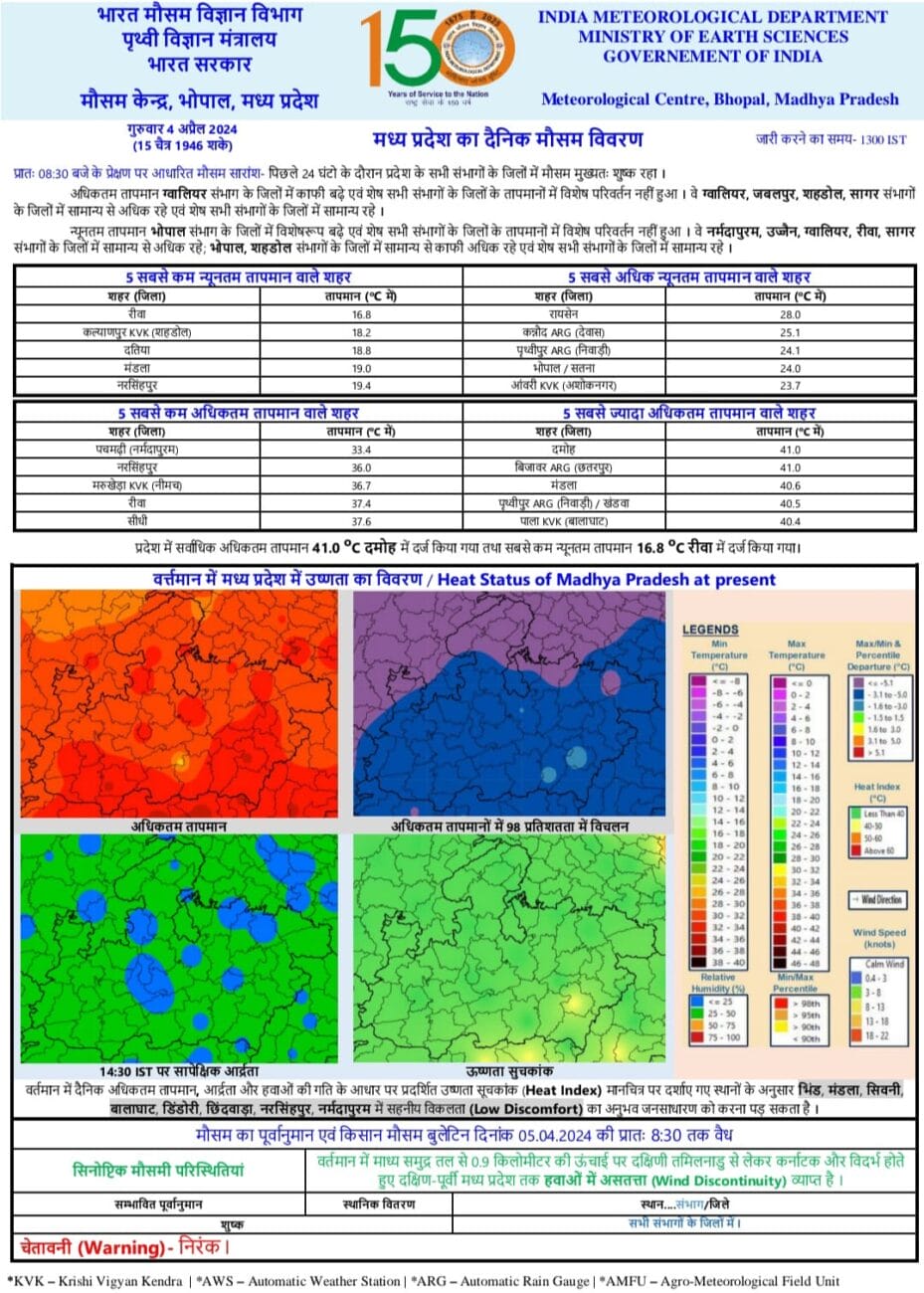 IMD ने जानकारी दी कि प्रदेश के कई जिलों में अधिकतम तापमान 40 डिग्री सेल्सियस से ऊपर चला गया है, पिछले 24 घंटों में प्रदेश में सबसे ज्यादा अधिकतम तापमान 41 डिग्री सेल्सियस दमोह और छतरपुर के बिजावर ARG में रिकॉर्ड किया गया, इसके अलावा मंडला में 40.6 डिग्री, खंडवा और निवाड़ी के पृथ्वीपुर ARG में 40.5 डिग्री सेल्सियस और बालाघाट के पाला KVK में 40.4 डिग्री सेल्सियस दर्ज किया गया।
