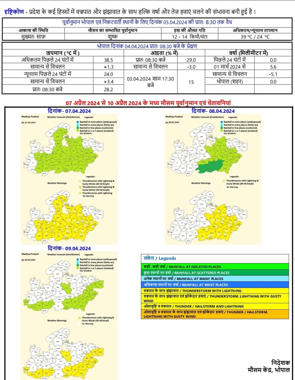 आईएमडी ने बताया कि इस समय दक्षिणी तमिलनाडु से लेकर कर्नाटक और विदर्भ होते हुए दक्षिण पूर्वी मध्य प्रदेश में हवाओं में डिस कंटिन्यूटी है, मौसम विभाग ने कहा कि आने वाले समय में प्रदेश के कई जिलों में वज्रपात और झंझावात के साथ हल्की बारिश और तेज हवाएं चलने की संभावना है।