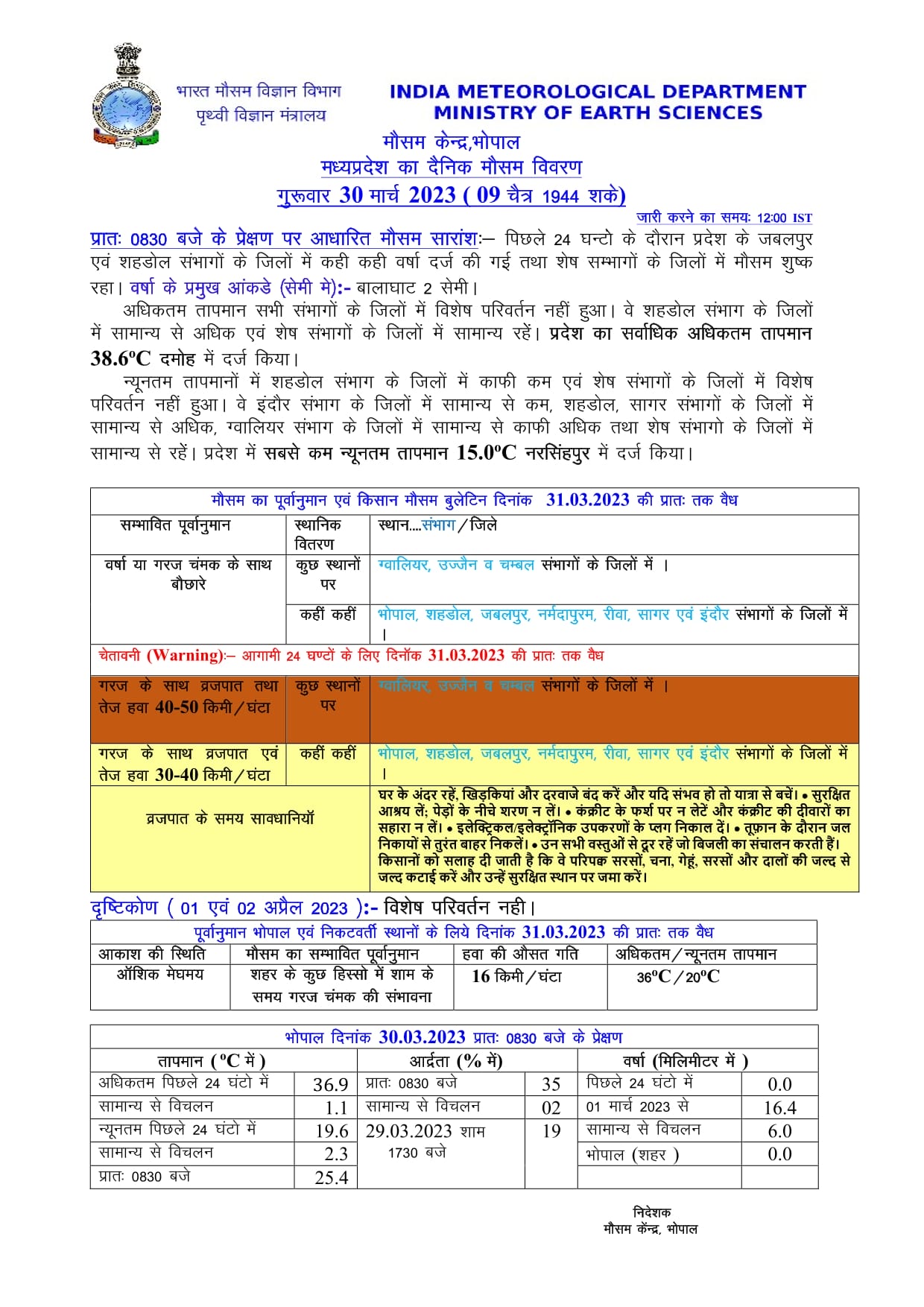 मौसम विभाग ने ग्वालियर चंबल और उज्जैन सभागों के जिलों में गरज के साथ बौछारें गिरने, वज्रपात होने यानि बिजली कड़कने और गिरने की सम्भावना जताई है साथ ही 40 से 50 किलोमीटर प्रति घंटे की रफ़्तार से तेज हवाएं चलने की भी सम्भावना जताई है , मौसम विभाग ने इन संभागों के जिलों के लिए ऑरेंज अलर्ट जारी किया है।