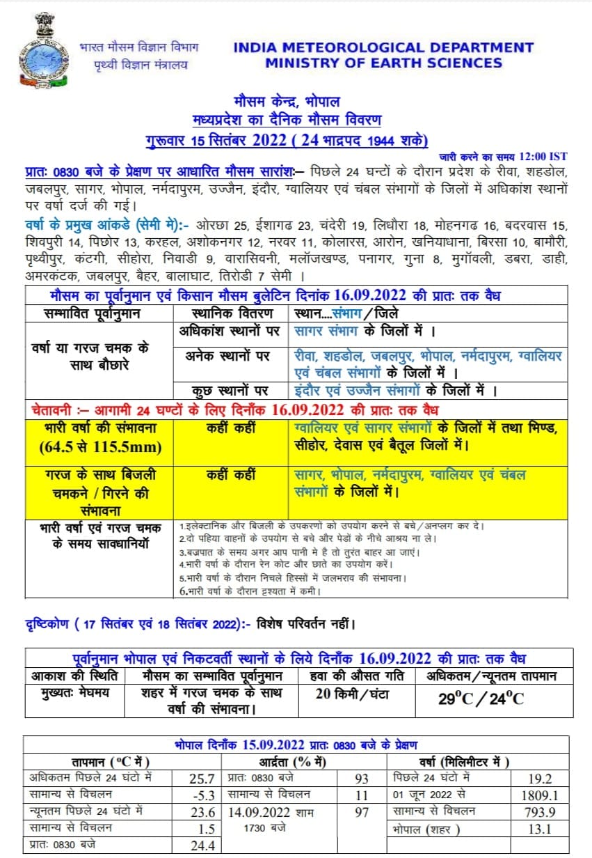 मौसम विभाग ने जारी अपनी दैनिक रिपोर्ट (MP Weather Daily Report) में बताया है कि पिछले चौबीस घंटों में रीवा, शहडोल, जबलपुर, सागर, भोपाल, नर्मदापुरम, उज्जैन, इंदौर, ग्वालियर और चम्बल संभाग के जिलों में अधिकांश स्थानों पर बारिश दर्ज की गई। राजधानी भोपाल के लिए आने वाले 24 घंटों का पूर्वानुमान जारी करते हुए मौसम विभाग ने गरज चमक के साथ बारिश की सम्भावना जताई है साथ ही 20 किलोमीटर प्रति घंटा की रफ़्तार से हवाएं भी चल सकती हैं।