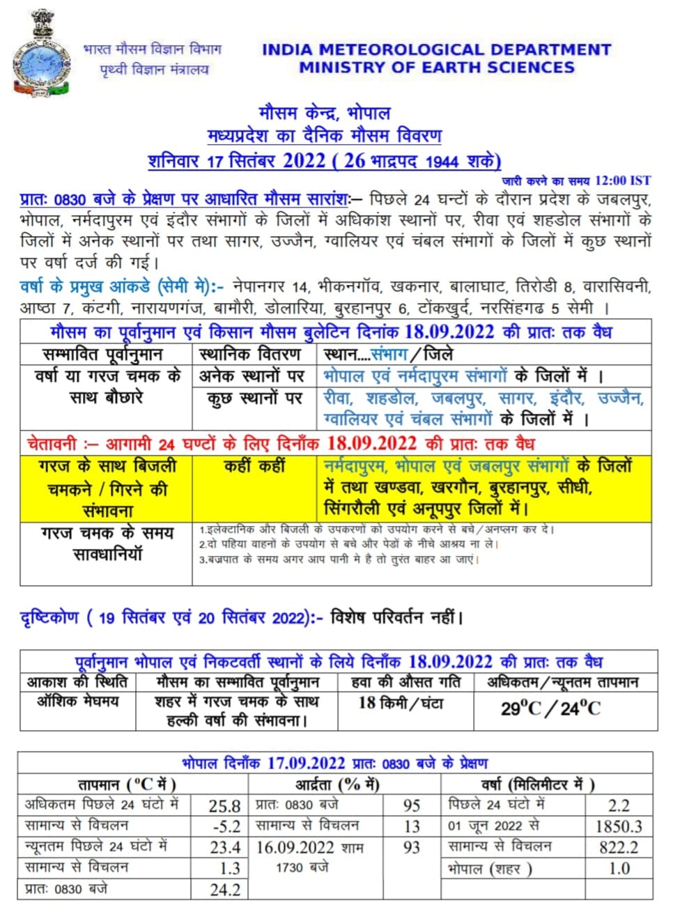 भोपाल, डेस्क रिपोर्ट। मध्य प्रदेश के मौसम (MP Weather) में बदलाव जारी है, प्रदेश में अभी मानसून सक्रिय है। मौसम विभाग ने आज जारी अपनी रिपोर्ट में प्रदेश के लगभग सभी जिलों में गरज चमक के साथ बौछारें गिरने की सम्भावना जताई है साथ ही 22 जिलों में बिजली चमकने/गिरने के येलो अलर्ट जारी किया है।