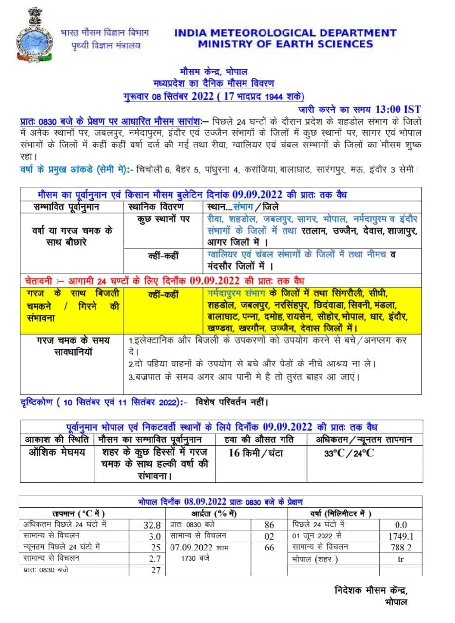मप्र मौसम विभाग (MP weather department) ने आज जारी दैनिक मौसम रिपोर्ट (MP Weather Daily Report) में रीवा, शहडोल, जबलपुर, सागर, भोपाल, नर्मदापुरम और इंदौर संभाग के जिलों के अलावा रतलाम, उज्जैन, देवास, शाजापुर, अगर मालवा जिलों में कुछ स्थानों पर और ग्वालियर, चम्बल संभाग के जिले एवं नीमच व मंदसौर जिलों में बारिश या गरज चमक के साथ बौछारें गिरने की संभावना (MP Weather Forecast) जताई है।