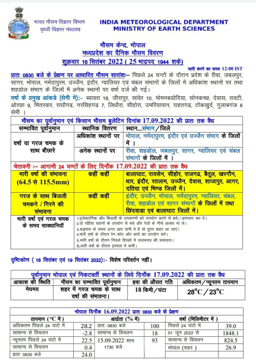 मौसम विभाग (IMD MP Weather Update) के मुताबिक बालाघाट, रायसेन, सीहोर, राजगढ़, बैतूल, खरगौन, धार, इंदौर, रतलाम, उज्जैन, देवास, शाजापुर, आगर, दतिया एवं भिंड जिलों में भारी बारिश के येलो अलर्ट जारी किया है वहीं इंदौर, उज्जैन, भोपाल, नर्मदापुरम, ग्वालियर, चम्बल, रीवा, शहडोल एवं सागर संभाग के जिलों में तथा छिंदवाड़ा एवं बालाघाट जिलों में गरज के साथ बिजली चमकने/गिरने के येलो अलर्ट जारी किया है।
