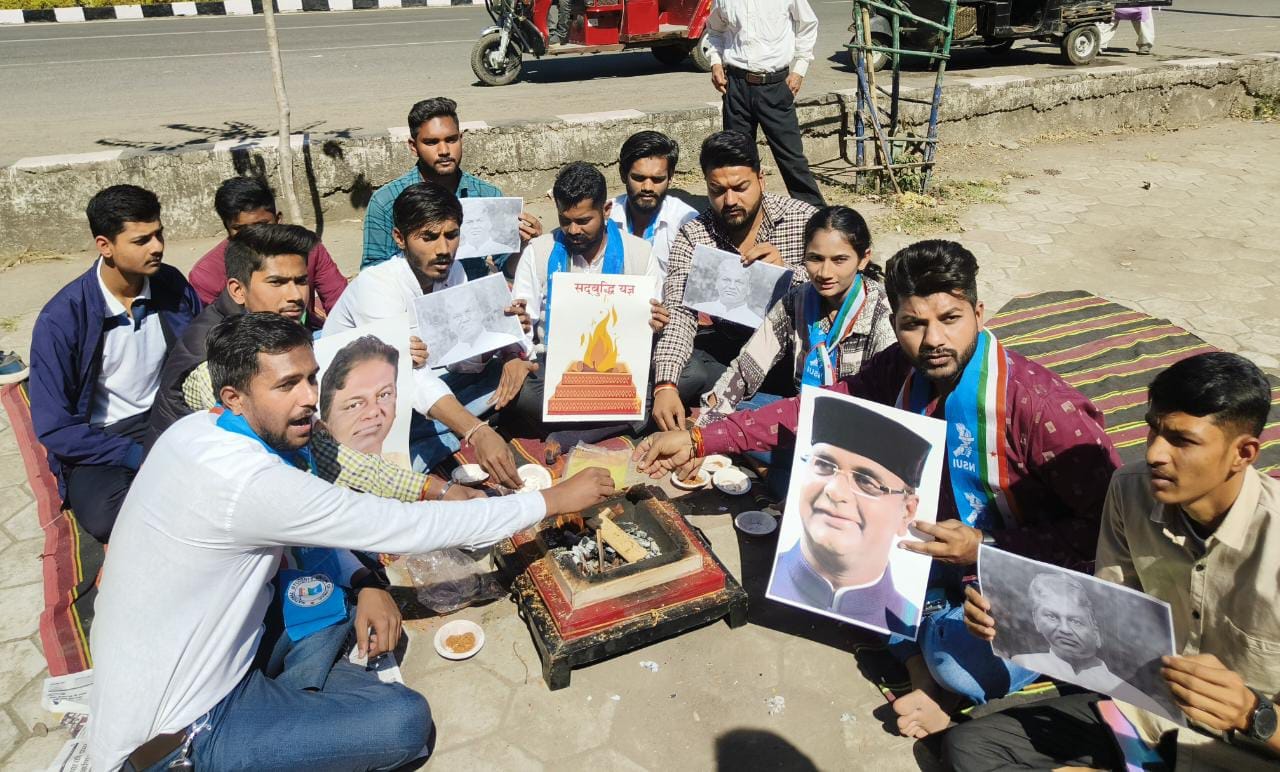 NSUI performed Yagya in Bhopal : नेशनल हेल्थ मिशन (NHM) की संविदा स्टाफ नर्स परीक्षा के पेपर लीक मामले को लेकर एनएसयूआई (NSUI) ने मोर्चा खोल दिया है। पर्चा आउट होने के दूसरे दिन एनएसयूआई मेडिकल विंग का अनोखा प्रदर्शन देखने को मिला। इन्होने भोपाल में स्वास्थ्य मंत्री प्रभुराम चौधरी की सद्बुद्धि के लिए यज्ञ का आयोजन किया।
