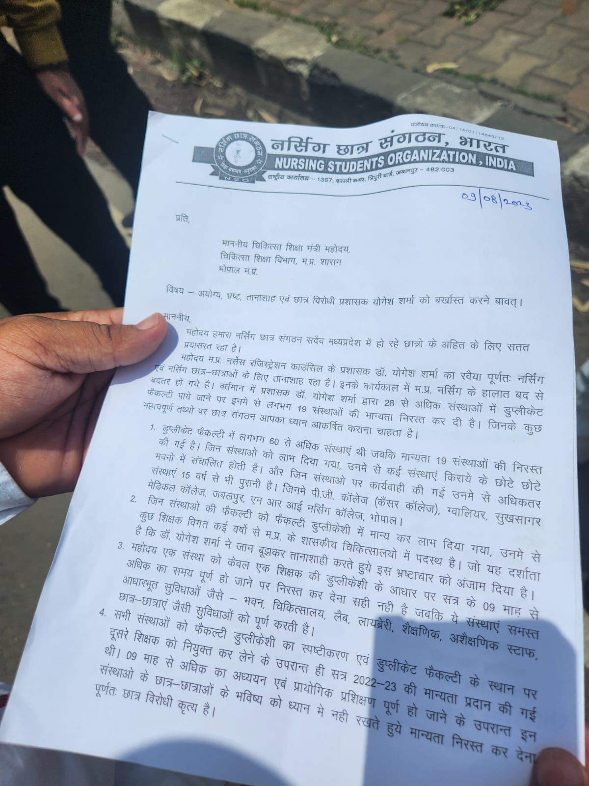 Nursing student organization wrote a letter to Vishwas Sarang : नर्सिंग छात्र संगठन ने चिकित्सा शिक्षा मंत्री विश्वास सारंग को पत्र लिखकर मध्य प्रदेश नर्सेस रजिस्ट्रेशन काउंसिल के प्रशासक डॉ. योगेश शर्मा को बर्खास्त करने की मांग की है। उन्होने कहा है कि इनके कार्यकाल में नर्सिंग के हालाद बद से बदतर हो रहे हैं और वो एक भ्रष्ट, तानाशाह व अयोग्य प्रशासक है। इसी के साथ उनके कार्यकाल में अनियमितताओं का आरोप लगाते हुए उच्च स्तरीय कमेटी बनाकर जांच की मांग भी की है।