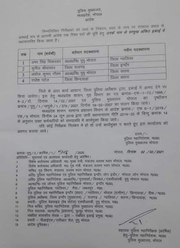 भोपाल, डेस्क रिपोर्ट| पुलिस मुख्यालय ने चार पुलिस निरीक्षकों (Police Inspector) के तबादले (Transfer) किये हैं। इनको ग्वालियर, इंदौर और सतना में पदस्थ किया गया है| मंगलवार को पुलिस मुख्यालय द्वारा निरीक्षकों के तबादला आदेश जारी किये हैं| आदेश के मुताबिक यह तबादले स्वयं के व्यय पर किये गए हैं|