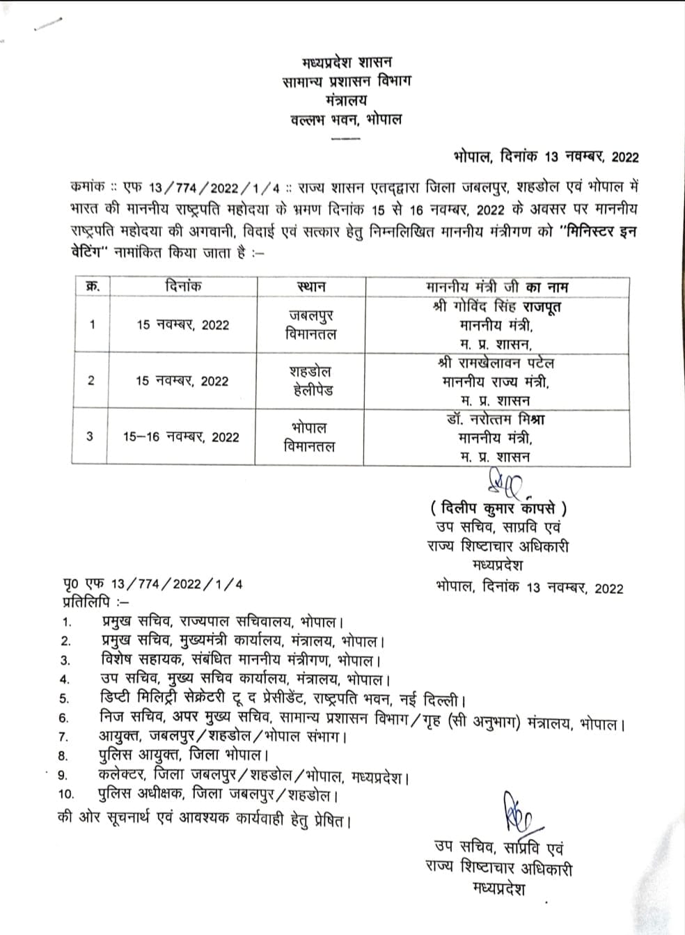 उधर राज्य शासन ने राष्ट्रपति के आगमन के लिए तैयारियां तेज कर दी हैं। शासन ने आदेश जारी करते हुए तीन मंत्रियों को मिनिस्टर इन वेटिंग बनाया है जो अलग अलग जगह राष्ट्रपति के स्वागत के लिए तैनात रहेंगे। कैबिनेट मंत्री गोविंद सिंह राजपूत 15 नवंबर को जबलपुर विमानतल पर राष्ट्रपति का स्वागत करेंगे, राज्य मंत्री राम खेलावन पटेल शहडोल हेलीपेड पर 15 नवंबर को राष्ट्रपति का स्वागत करेंगे वहीं गृह मंत्री डॉ नरोत्तम मिश्रा 15 नवंबर को भोपाल विमानतल पर राष्ट्रपति का स्वागत करेंगे और 16 नवंबर को उनके प्रस्थान के समय भी मौजूद रहेंगे।