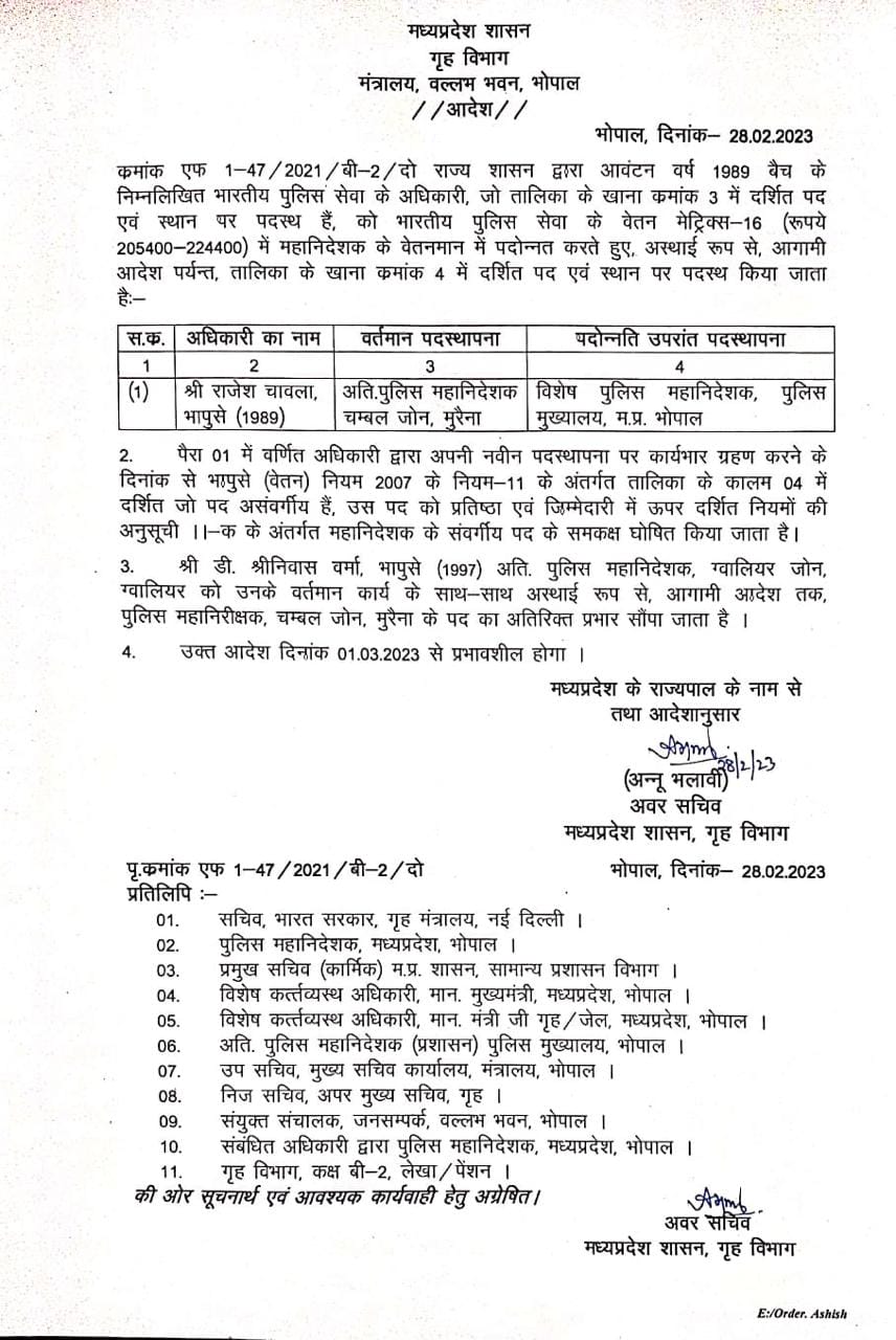 MP IPS Promotion : मध्य प्रदेश सरकार ने आज 1989 बैच के एक आईपीएस अधिकारी को पदोन्नत कर अतिरिक्त पुलिस महानिदेशक से पुलिस महानिदेशक बनाया है, गृह विभाग (MP Home Department) ने आज 28 फरवरी को पदोन्नति आदेश जारी किये। गृह विभाग के आदेश में कहा गया है कि IPS अधिकारी राजेश चावला (अतिरिक्त पुलिस महानिदेशक, चंबल जोन, मुरैना) को भारतीय पुलिस सेवा के वेतम मेट्रिक्स -16 (रुपये 205400 -224400) में महानिदेशक के वेतनमान में पदोन्नत किया जाता है। आदेश में पदोन्नति के बाद आईपीएस राजेश चावला को विशेष पुलिस महानिदेशक पुलिस मुख्यालय भोपाल पदस्थ किया है।