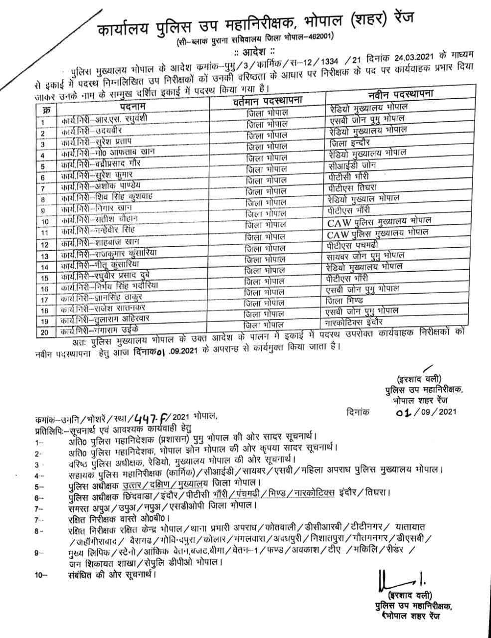 भोपाल, डेस्क रिपोर्ट। मध्यप्रदेश (Madhya Pradesh) की राजधानी भोपाल (Bhopal District) में पुलिसकर्मियों (MP Police) को पदोन्नति (Promotion) दी गई है।यह पदोन्नति (Promotion) भोपाल डीआईजी इरशाद वली (Bhopal DIG) द्वारा दी गई है। इसके तहत 20 कार्यवाहक निरीक्षकों की नवीन पदस्थापना की गई है।