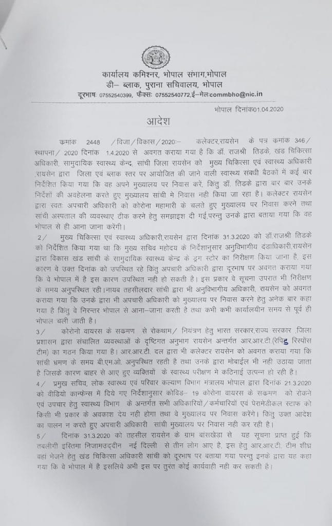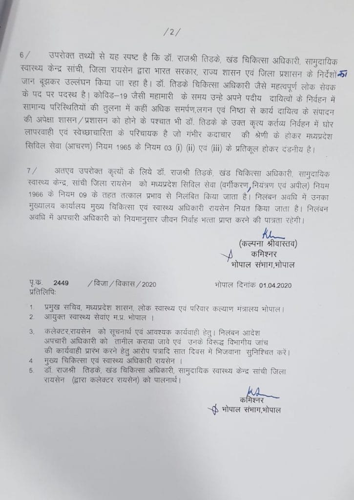 कोरोना वायरस कोविड-19 बीमारी के संक्रमण की स्थिति को देखते हुए स्वास्थ्य विभाग के कार्य को दृष्टिगत रखते हुए मुख्य चिकित्सा एवं स्वास्थ्य अधिकारी ने अधिकारी कर्मचारियों को मुख्यालय पर अनिर्वाय रूप से रहने के निर्देश दिए हैं| इसके बावजूद खंड चिकित्सा अधिकारी साँची डॉ.राजश्री तिड़के भोपाल से आना जाना करती रही| मुख्य चिकित्सा एवं स्वास्थ्य अधिकारी द्वारा उन्हें निर्देशित किया गया था कि अपने मुख्यालय पर निवास करें, लेकिन डॉ तिड़के भोपाल से आना जाना करती रही और समय पूर्व निकल जाया करती थी| अधिकारी की लापरवाही पर भोपाल संभागायुक्त कल्पना श्रीवास्तव ने निलंबन की कार्रवाई की है|