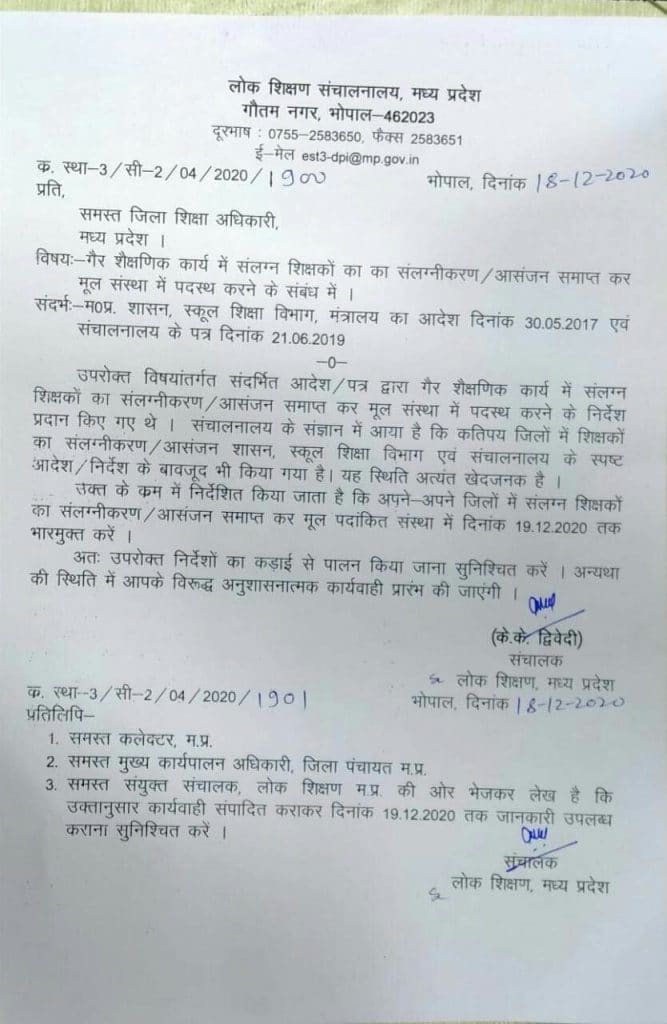 भोपाल, डेस्क रिपोर्ट| मध्य प्रदेश (Madhyapradesh) में 10 वीं और 12 वीं कक्षा के छात्रों की कक्षाएं शुरू हो गई है| इस बीच राज्य शासन ने गैर शैक्षणिक कार्य कर रहे शिक्षकों (Teachers) का संलग्नीकरण समाप्त कर उन्हें मूल संस्था में पदस्थ करने के आदेश दिए हैं| सभी जिला शिक्षा अधिकारी (DEO) को सख्त लहजे में कहा गया है कि ऐसे शिक्षकों का संलग्नीकरण, आसंजन 19 दिसम्बर तक खत्म कर शासन को जानकारी भेजें अन्यथा उनके विरुद्ध अनुशासनात्मक कार्यवाही की जाएगी।