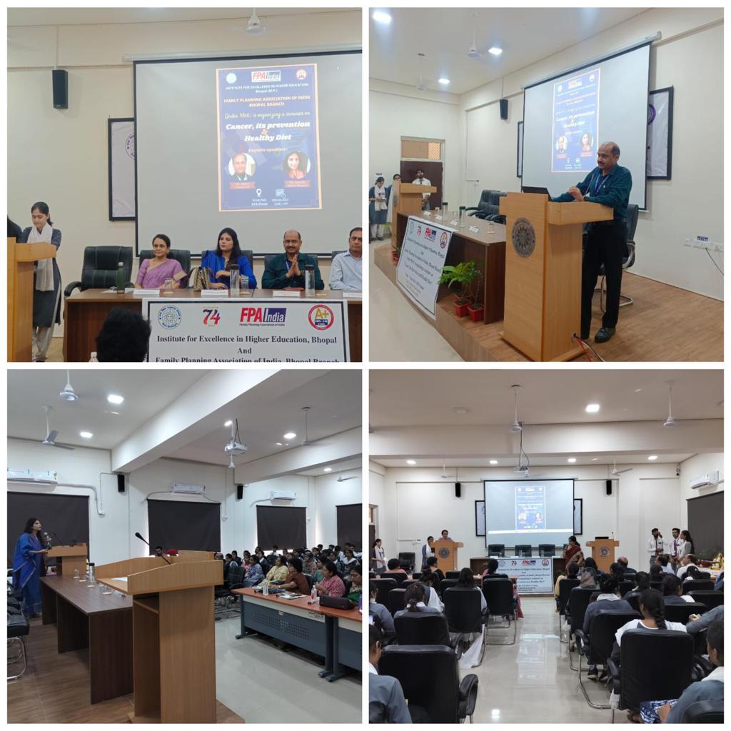 इस अवसर पर संचालक ने कैंसर रोग पर अपने विचार रखे एवं विद्यार्थियों को इस बीमारी से सर्तक रहने का सुझाव दिया FPAI की चेयरपरसन डॉ रूचिरा चौधरी द्वारा फैमिली प्लानिंग एसोसिएशन ऑफ इंडिया का संक्षिप्त इतिहास बताया गया। उन्होने बताया कि यह 74 वर्ष पुरानी स्वयंसेवी एवं गैर सरकारी संगठन है, जो निरन्तर पूरे देश में यौन एवं प्रजनन स्वास्थ तथा उससे संबंधित स्वास्थ सेवाएं उपलब्ध कराती है। सेमिनार में विषय विशेषज्ञ के रूप में मनोज चतुर्वेदी, चेयरमैन एवं संस्थापक भोपाल कैंसर रिसर्च एन्ड वेलफेयर एसोसिएशन एवं आहार विशेषज्ञ एवं डॉ समरा अख्तर हुसैन ने अपने व्याख्यान से विद्यार्थियों को कैंसर और उससे संबंधित आहार पर महत्वपूर्ण जानकारी प्रदान की। ब्रान्च मैनेजर नीलेश चौबे द्वारा विद्यार्थियों का FPAI के बारे में उन्मुखीकरण किया गया।
