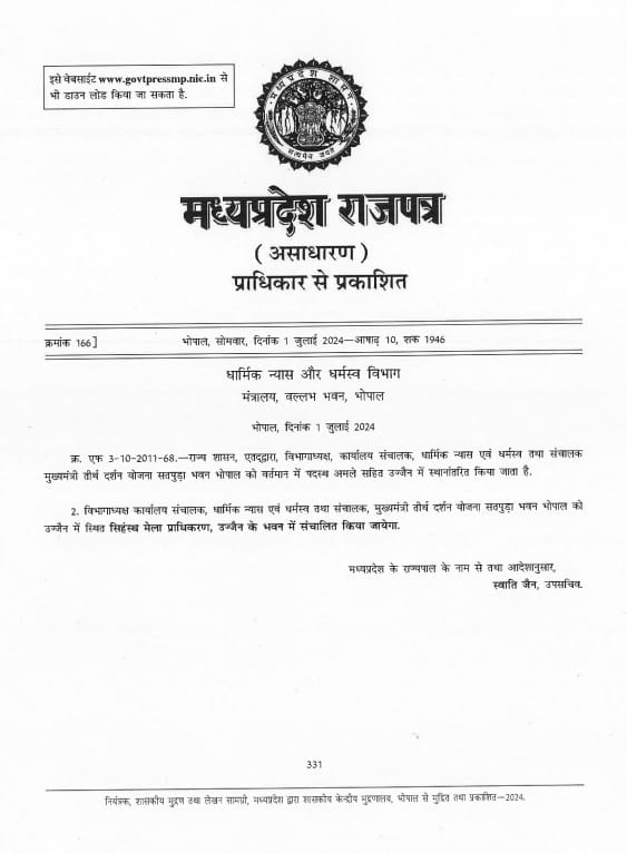 नोटिफिकेशन के मुताबिक अब धार्मिक न्यास और धर्मस्व विभाग के संचालक, विभागाध्यक्ष तथा संचालक मुख्यमंत्री तीर्थ दर्शन योजना सतपुड़ा भवन भोपाल को वर्तमान पदस्थ अमले सहित उज्जैन स्थानांतरित किया जाता है , अब से ये विभाग उज्जैन में सिंहस्थ मेला प्राधिकरण के भवन में संचालित होगा।