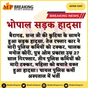 Bhopal -Car hit policemen in Bairagarh : भोपाल के बैरागढ में एक बड़ा हादसा हुआ है, इस हादसे में तीन पुलिसकर्मी गंभीर रूप से घायल हो गए है, हादसा सन्त जी की कुटिया के सामने हुआ है, बताया जा रहा है कि तेज रफ्तार कार ने पुलिस कर्मियों को जोरदार टक्कर मारी है, टक्कर लगते ही तीनों पुलिसकर्मी सड़क पर गिर गए, जिन्हे फौरन अस्पताल पहुंचाया गया है जहां उनका इलाज जारी है, वही कार चालक को गिरफ्तार कर लिया गया है, चालक 27 साल का मनोज कोरी पुत्र ओम प्रकाश है, स्थानीय लोगों के अनुसार हादसा एक महिला को बचाने के चक्कर में हुआ है। घायलों को देखने भोपाल पुलिस कमिश्नर हरी नारायण चारी अस्पताल पहुंचे।