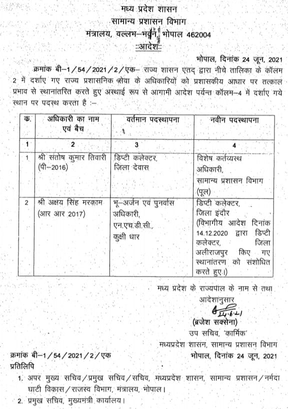 भोपाल, डेस्क रिपोर्ट। मध्य प्रदेश (Madhya Pradesh)में जारी नई ट्रांसफर पॉलिसी के बीच अधिकारियों के तबादलों (Transfer) का दौर जारी है।अब राज्य शासन ने राज्य प्रशासनिक सेवा (SAS Transfer) के अधिकारियों के तबादले किए गए है।इसके तहत संतोष कुमार तिवारी, OSD सामान्य प्रशासन विभाग बनाए गए हैं। वहीं अक्षय सिंह मरकाम को इंदौर का डिप्टी कलेक्टर बनाया गया है।