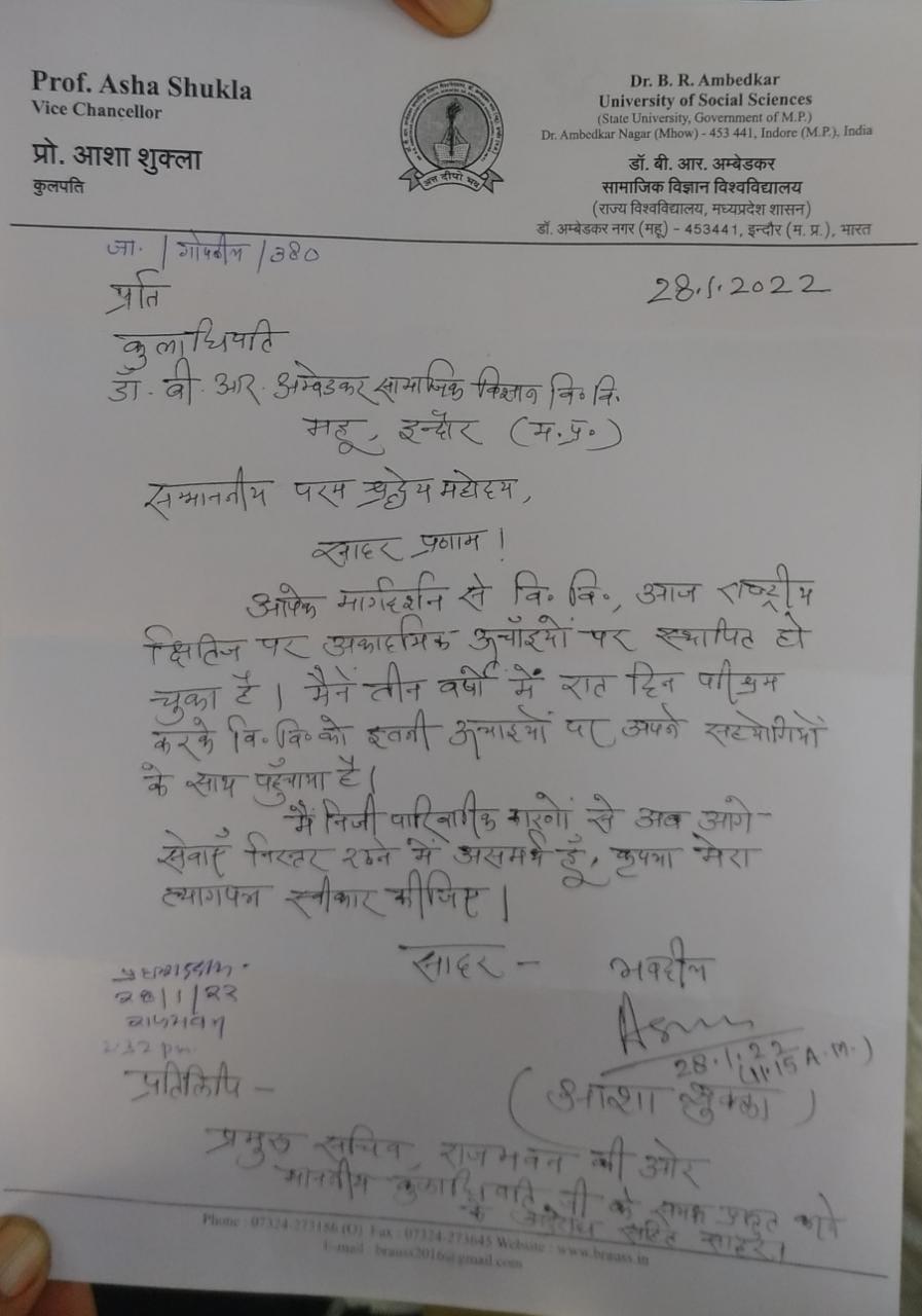 इधर, आशा शुक्ला का इस्तीफा भी सोशल मीडिया पर वायरल हो रहा है, जिसमें उन्होंने लिखा है कि आपके मार्गदर्शन से विश्वविद्यालय को इतनी ऊंचाइयों पर अपने सहयोगियों के साथ पहुंचाया है। मैं अपने निजी कारणों से अब आगे सेवाएं निरंतर रखने में असमर्थ हूं। कृपया मेरा त्यागपत्र स्वीकार कीजिए।