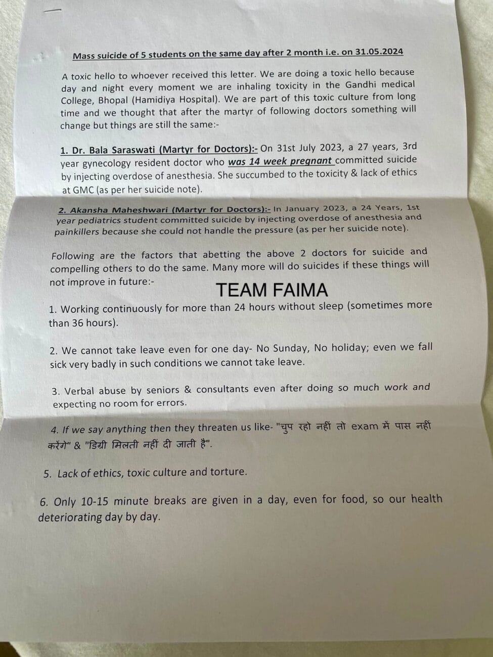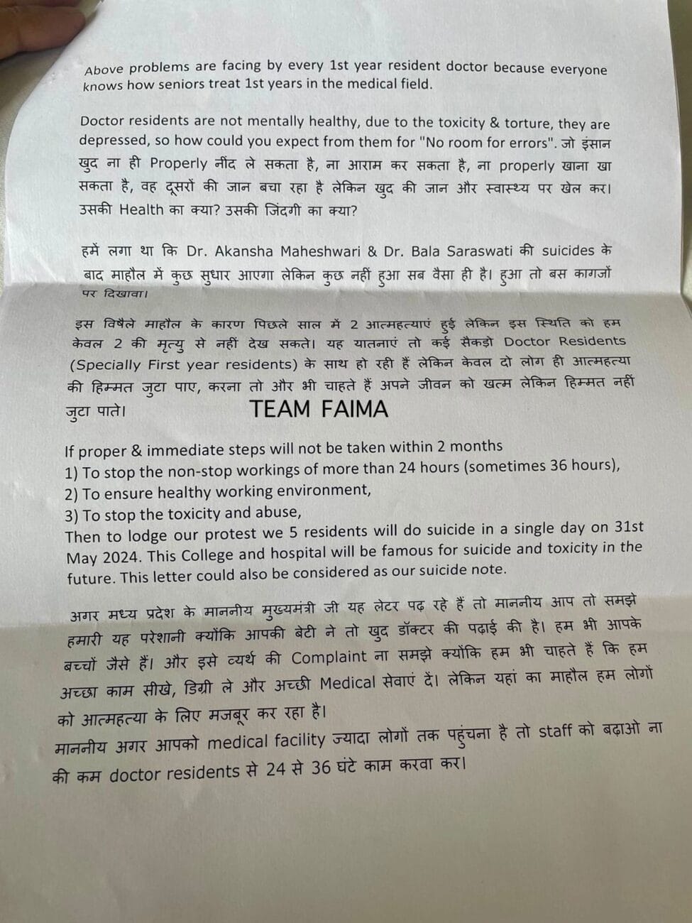 इन स्टूडेंट्स ने लिखा हमें 24 से 36 घंटे काम कराया जाता है और अच्छे स्वास्थ्य सेवाओं की उम्मीद की जाती है ये हमारे साथ ज्यादती और अन्याय है हमें काम के लिए स्वस्थ्य वातावरण नहीं मिलता, गालियाँ मिलती हैं, यदि दो महीने के अन्दर इन व्यवस्थाओं में सुधार नहीं हुआ तो दो महीने बाद 31 मई को हम पांच डॉक्टर्स एक ही दिन सामूहिक आत्म हत्या कर लेंगे, तब हमारे इस पत्र को ही सुसाइड not मान लिया जाये।