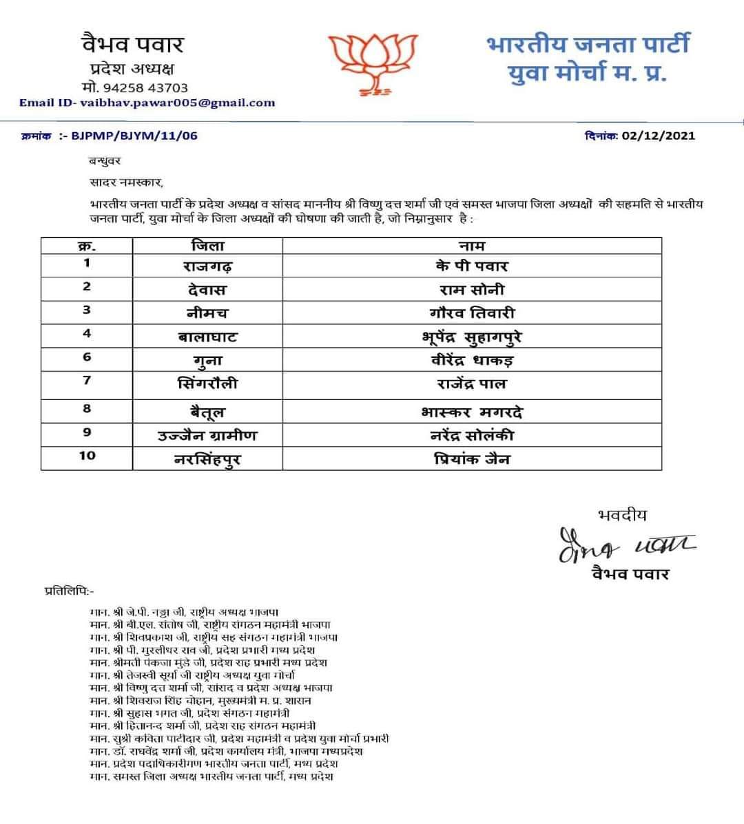 भोपाल, डेस्क रिपोर्ट। भारतीय जनता पार्टी के प्रदेश अध्यक्ष और सांसद वी डी शर्मा ने युवा मोर्चा के जिला अध्यक्षों के नाम की घोषणा की है,जिला अध्यक्षों की सहमति के बाद इन नामो की सूची जारी की गई है, देखिये जारी सूची..