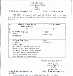 भोपाल, डेस्क रिपोर्ट। मध्य प्रदेश में अधिकारियों के तबादलों (MP Transfer) का दौर जारी है। आए दिन आईएएस-आईपीएस अधिकारियों को इधर से उधर किया जा रहा है। अब राज्य शासन के सामान्य प्रशासन विभाग ने 2 IAS अधिकारियों (IAS officers transfers) के तबादला आदेश जारी किये हैं, जिसकी लिस्ट नीचे दी गई है।