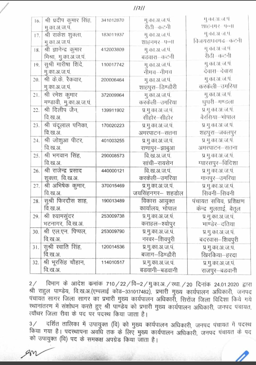 भोपाल, डेस्क रिपोर्ट| मध्य प्रदेश (Madhya Pradesh) में तबादलों का दौर जारी है| राज्य शासन ने अब सीईओ जनपद पंचायत (CEO Janpad Panchayat) और विकास खण्ड अधिकारी के तबादले किये हैं। पंचायत और ग्रामीण विकास विभाग ने तबादला सूची (Transfer List) जारी की है, जिसमे 32 अफसरों को इधर से उधर किया गया है।