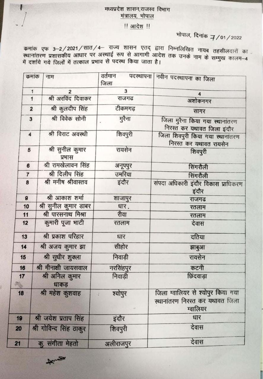 Home/Bhopal/Transfer Of Naib Tehsildars In The State See The List Released Mhkप्रदेश में नायब तहसीलदारों के तबादले, देखे जारी सूचीWritten by:Harpreet KaurListenSHAREPublished:7 January 2022 at 16:43 ISTभोपाल, डेस्क रिपोर्ट। राज्य सरकार के राजस्व विभाग ने 62 नायब तहसीलदारों का ट्रांसफर आदेश जारी किया है, देखिए जारी सूची.. ये भी पढ़ें1राममंदिर की प्रतिकृति का सीएम डॉ मोहन यादव ने किया शुभारम्भ, रामेश्वर शर्मा की अपील 31 दिसंबर को मदहोश ना हों धर्म का जागरण करें2शालिनी एप के जरिए आदिवासियों को मिलेगी सभी जानकारी, मंत्री विजय शाह ने बताई विभाग की उपलब्धियां3जीतू पटवारी और दिग्विजय सिंह के बयान पर सियासत तेज, पीसी शर्मा उतरे समर्थन में, रामेश्वर शर्मा का पलटवार4दो खूंखार कुत्ते, फिर भी घर में हुई लाखों रुपए की चोरी, चोरों ने इस तरकीब से दिया अंज़ाम