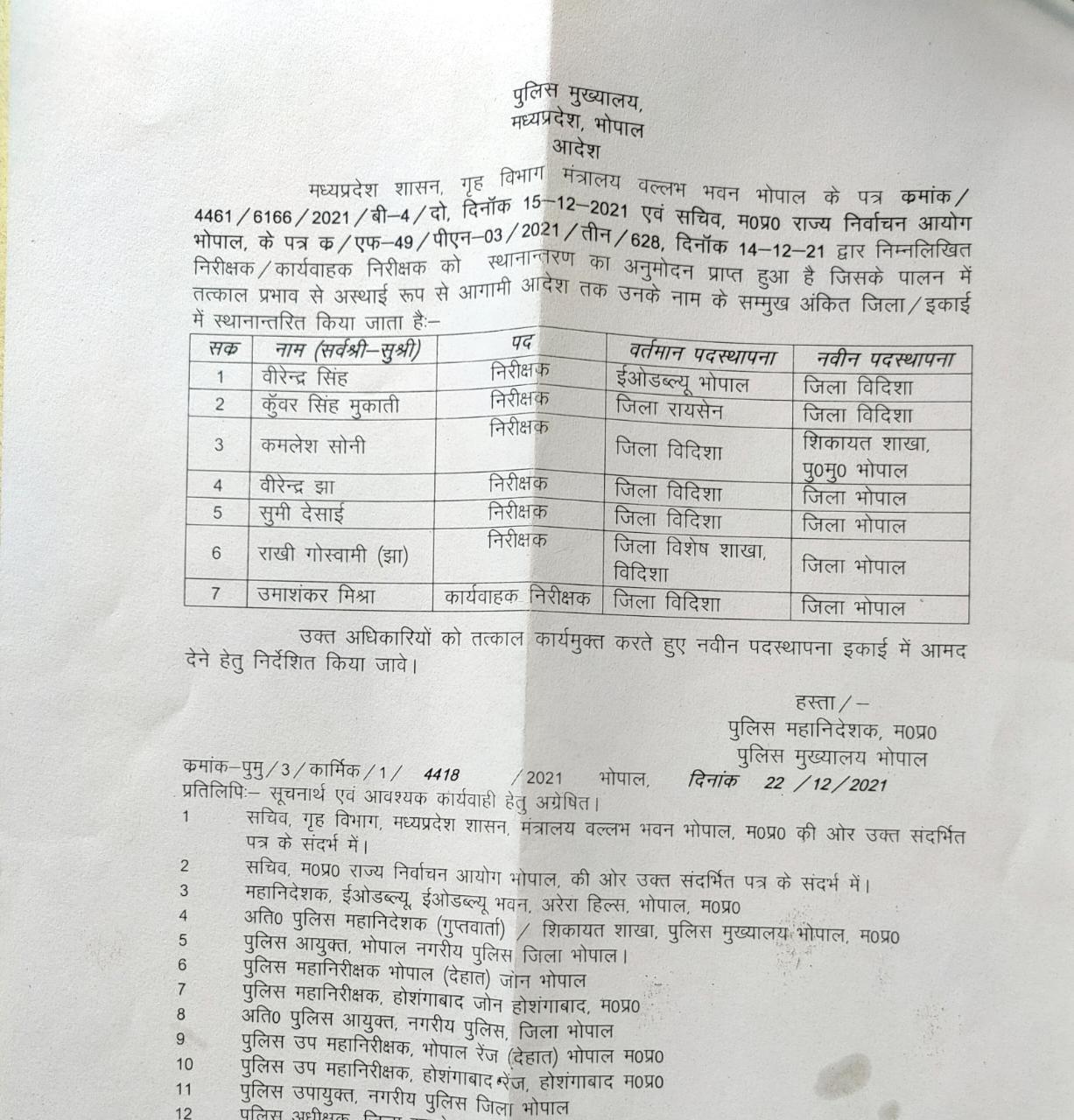 Home/Bhopal/Transfer Of Police Inspectors See The List Released Mhkपुलिस निरीक्षकों के तबादले, देखिए जारी सूचीWritten by:Harpreet KaurListenSHAREPublished:23 December 2021 at 23:16 IST भोपाल, डेस्क रिपोर्ट। पुलिस हेडक्वार्टर भोपाल से पुलिस निरीक्षकों की तबादला सूची जारी की गई है। प्रदेश में होने वाले त्रिस्तरीय पंचायत चुनावों के मद्देनजर राज्य निर्वाचन आयोग के पत्र के बाद यह तबादले किए गए है, देखिए जारी सूची.. ये भी पढ़ें1दो खूंखार कुत्ते, फिर भी घर में हुई लाखों रुपए की चोरी, चोरों ने इस तरकीब से दिया अंज़ाम2जीतू पटवारी ने मुकेश नायक का इस्तीफा अस्वीकार किया, प्रदेश कांग्रेस मीडिया विभाग के अध्यक्ष पद से दिया था त्यागपत्र3AAI ग्राहक संतुष्टि सर्वे 2025: सुविधाओं में अव्वल, भोपाल एयरपोर्ट बना यात्रियों की पहली पसंद4MP में 5 हजार सरकारी स्कूल बंद होने की कगार पर, लगभग साढ़े तीन लाख ड्रॉप आउट, उमंग सिंघार ने सरकार से किया सवाल- बच्चे पढ़ाई क्यों छोड़ रहे हैं