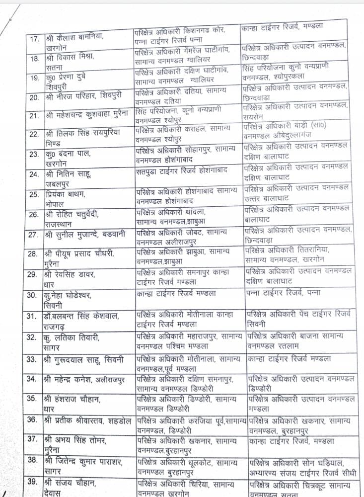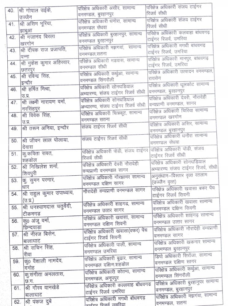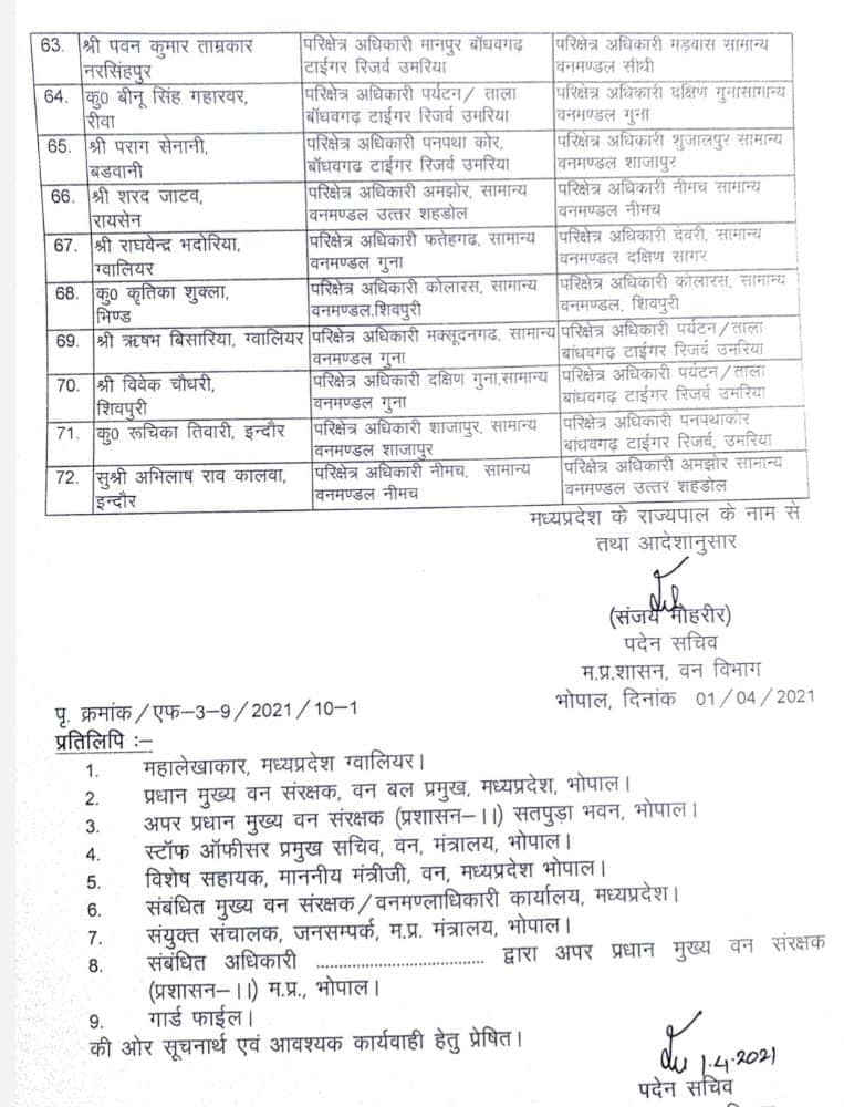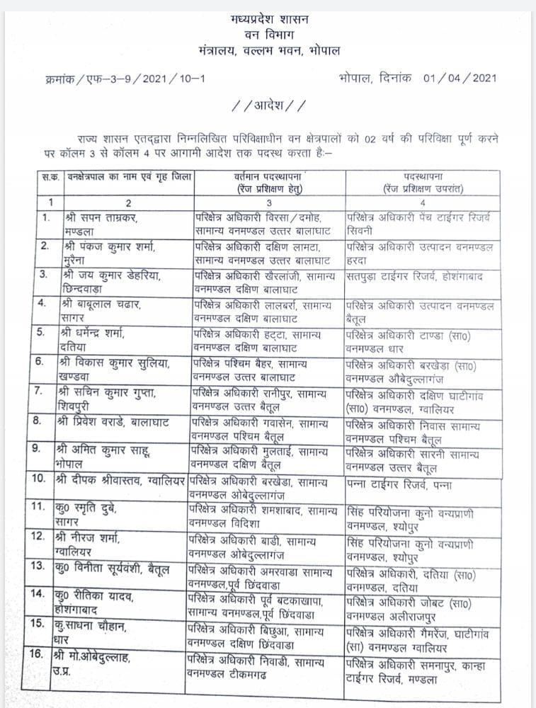 भोपाल, डेस्क रिपोर्ट। वन विभाग में क्षेत्रपालों की नवीन पदस्थापना (Transfer) की गई है। वन विभाग द्वारा जारी आदेश में दो साल की परिविक्षा पूरी करने वाले वन क्षेत्रपालों को इधर से उधर किया गया है। आदेश के अनुसार 72 क्षेत्रपालों का स्थानांतरण किया गया है। पूरी लिस्ट देखिये यहां-