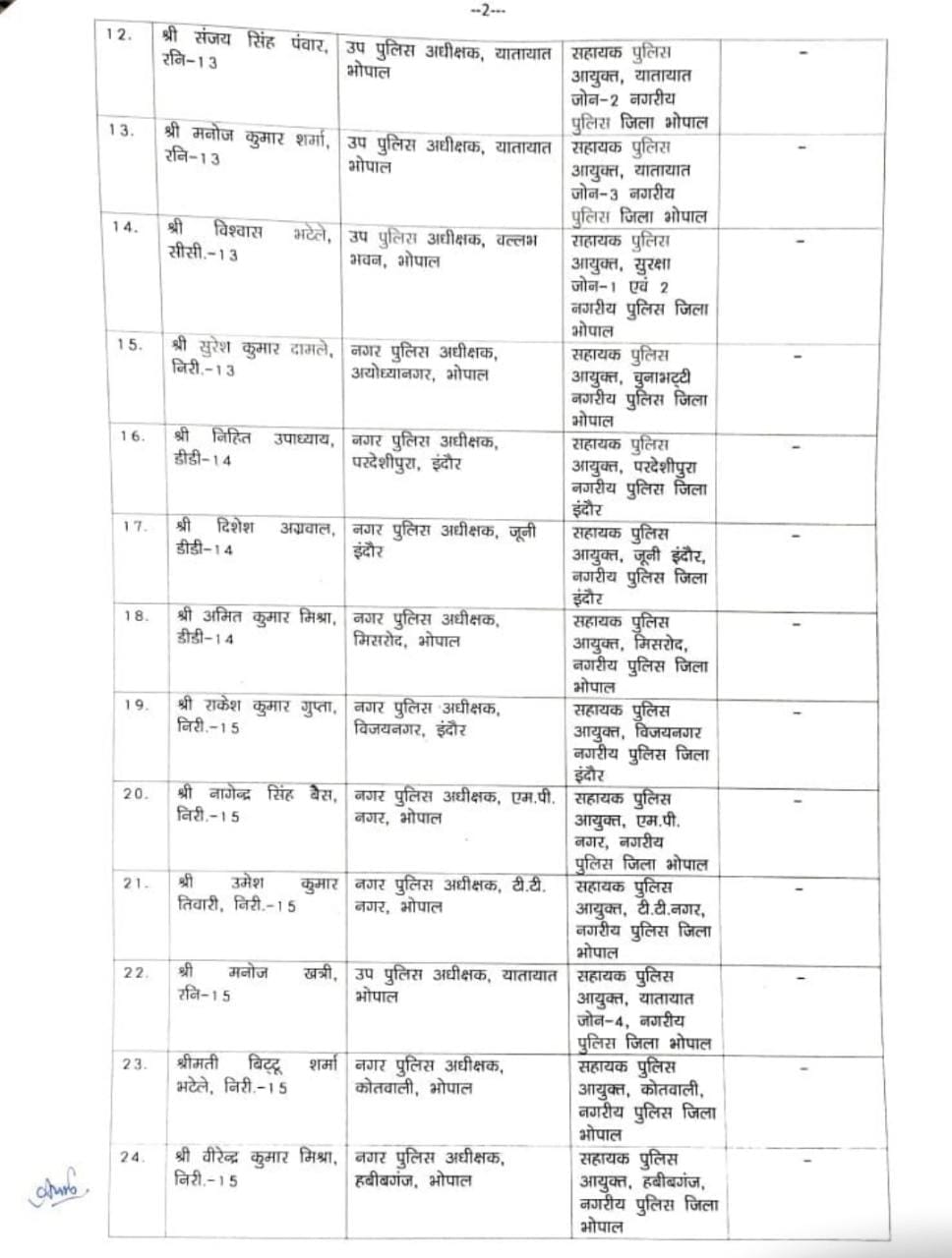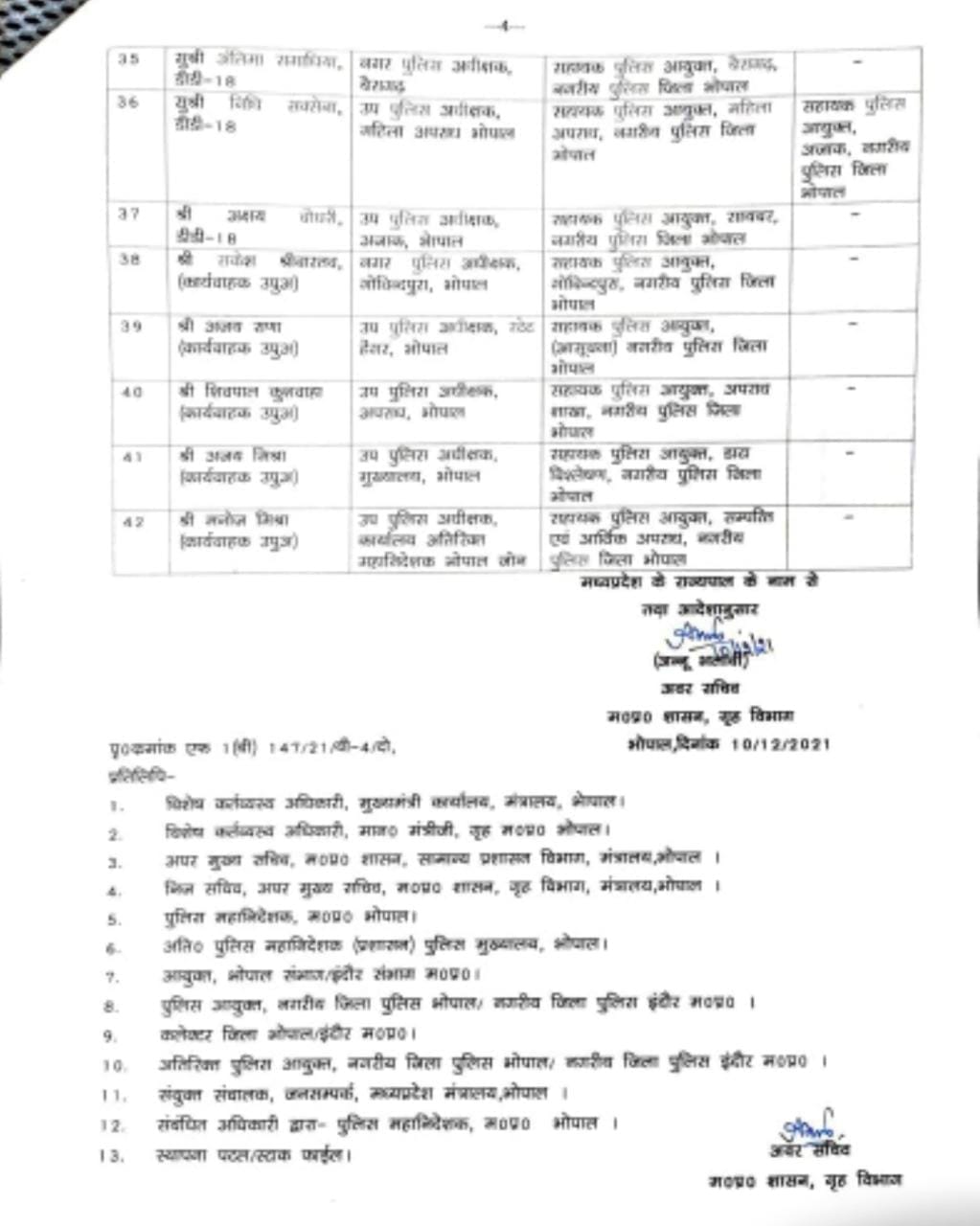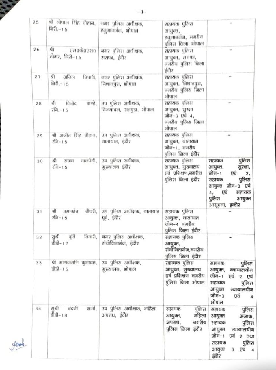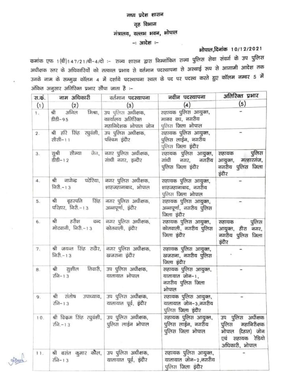 भोपाल, डेस्क रिपोर्ट। राज्य सरकार के गृह विभाग ने राज्य पुलिस सेवा के उप पुलिस अधीक्षक स्तर के अधिकारियों के तबादला आदेश जारी किए है, देखिए जारी सूची….