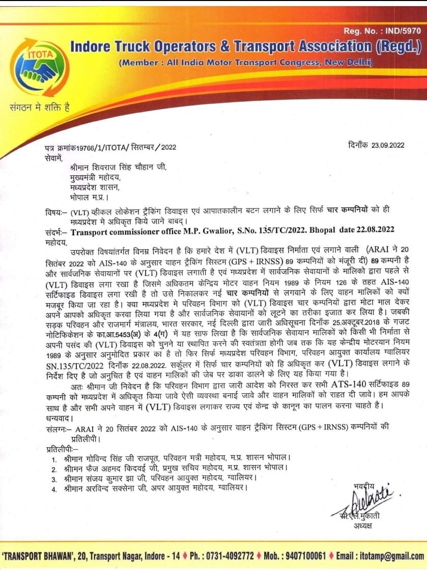 पूरे देश के अंदर ऐसी ATS-140 सर्टिफाइड 89 कंपनियां है लेकिन मध्य प्रदेश के परिवहन विभाग आयुक्त कार्यालय के 22 अगस्त के सर्कुलर से सिर्फ चार कंपनियों को ही व्हीकल लोकेशन ट्रैकिंग डिवाइस व पैनिक बटन लगाने के निर्देश दिए गए हैं। यानि सीधे तौर पर 85 कंपनियों को दरकिनार कर 4 विशेष कंपनियों को ही लाभ पहुंचाया जा रहा है।