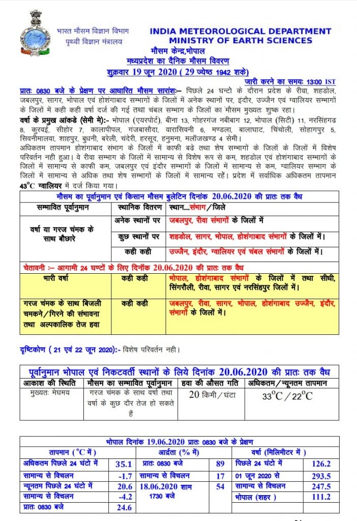विभाग ने भोपाल, होशंगााबाद संभागों में, सीधी, सिंगरौली, रीवा , सागर और नरसिंहपुर जिलों में भारी बारिश की चेतावनी दी गई है। विभाग की माने तो प्रदेश के ज्यादातर जिलों में बारिश का दौर जारी रहेगा। 22 जून को मध्यप्रदेश में एक और सिस्टम सक्रिय हो रहा है जिससे 22,23,24 जून को प्रदेश में भारी बारिश होने के आसार हैं। अभी सिर्फ इंदौर, उज्जैन और चंबल में ही बारिश नॉर्मल से कम हुई है। इसके अलावा प्रदेश भर में सभी जगहों पर नॉर्मल और उससे अधिक पानी गिर चुका है। अगले सात से आठ दिन इसी तरह भोपाल और उसके आसपास पानी गिरता रहेगा। प्रदेश में ग्वालियर एवं भिंड को छोड़कर 52 में से 50 जिलों में सामान्य से ज्यादा बारिश हो चुकी है।