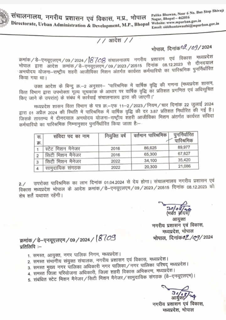 MP Samvida karmachari Salary: मध्य प्रदेश के संविदाकर्मियों के लिए खुशखबरी है।राज्य सरकार ने संविदा कर्मचारियों के वेतन में 3.87 प्रतिशत वृद्धि की है। नई दरें अप्रैल 2024 से प्रभावी होंगी। इस संबंध में नगरीय प्रशासन एवं विकास विभाग के आयुक्त भरत यादव ने आदेश जारी कर दिए है। हालांकि एरियर को लेकर आदेश में कोई जिक्र नहीं किया गया है।
