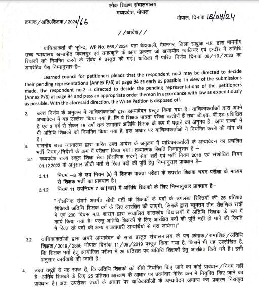 - यह आदेश जबलपुर हाईकोर्ट के निर्देश पर अतिथि शिक्षकों की नियमित करने की याचिका का DPI ने निराकरण करते हुए जारी किया।इसमें लिखा है कि राज्य स्कूल शिक्षा सेवा (शैक्षणिक संवर्ग) सेवा शर्ते एवं भर्ती नियम 2018 एवं संशोधित नियम एक दिसंबर 2022 के अनुसार सीधी भर्ती से रिक्त पदों की पूर्ति के लिए शिक्षक पात्रता परीक्षा के बाद शिक्षक चयन परीक्षा के माध्यम से शिक्षक भर्ती का प्रविधान है। सीधे नियमित किए जाने का कोई प्रविधान/नियम नहीं है ।