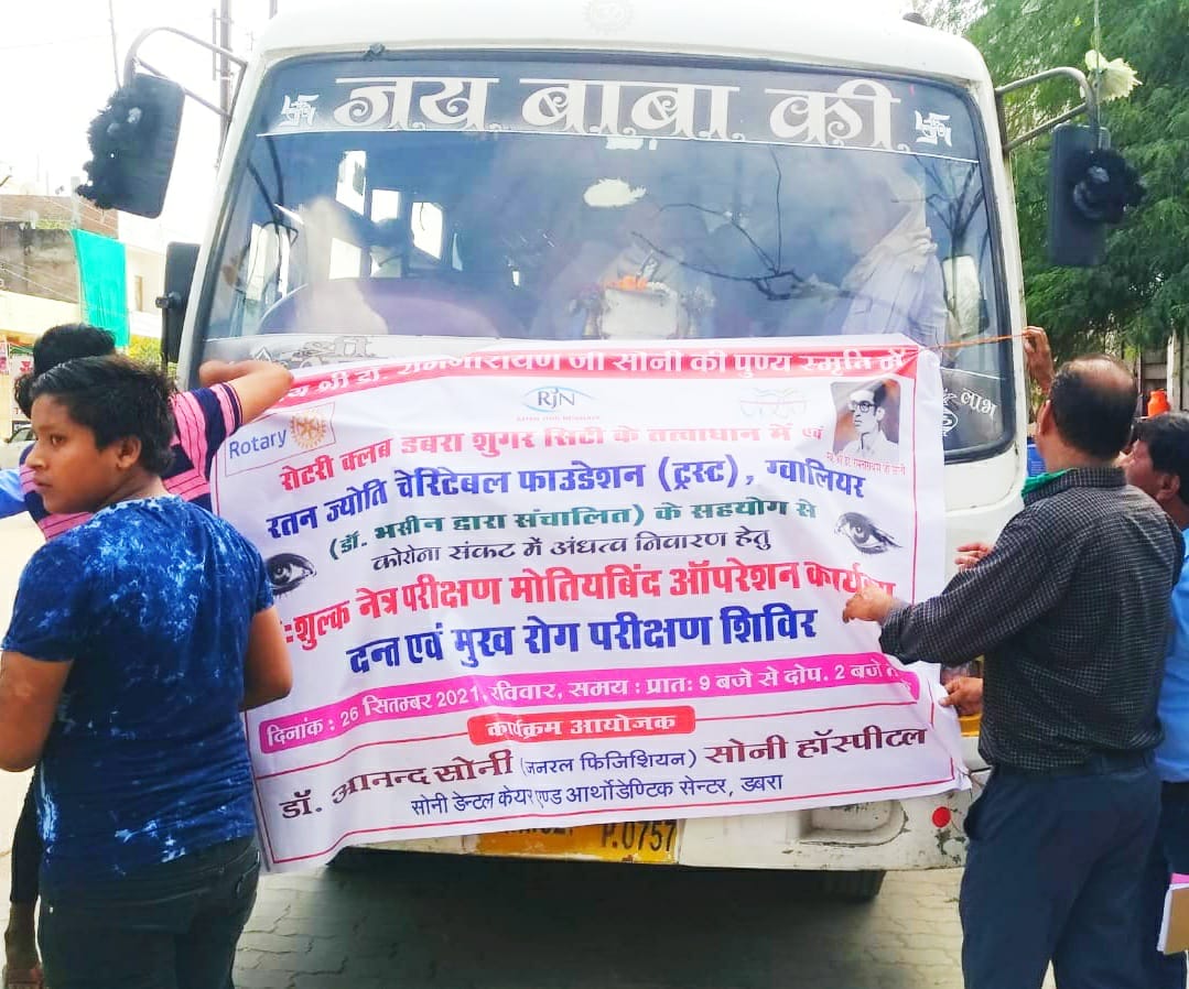 आपको बता दें यह परीक्षण शिविर डॉक्टर आनंद सोनी, सोनी हॉस्पिटल,सोनी डेंटल केयर एवम ऑर्थोडॉन्टिक सेंटर डबरा में आयोजन किया गया जिससे शहर की जनता को काफी लाभ मिला। इतना ही नहीं डबरा में नेत्र परीक्षण के बाद मोतियाबिंद से ग्रसित मरीजों को रतनज्योति ट्रस्ट एवं रोटरी क्लब द्वारा बस सेवा प्रदान कराते हुए ग्वालियर ले जाया गया, वहां मरीजों का ऑपरेशन करने के बाद वापस डबरा पहुंचाया जाएगा।