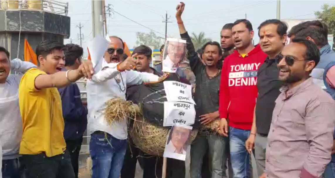 Damoh News : दमोह के अस्पताल चौराहे पर आज दमोह जिले के हिंदू संगठनों के द्वारा नागपुर महाराष्ट्र के श्याम मानव का पुतला दहन किया गया। हिंदू संगठनों के लोगों के द्वारा बताया गया है कि छतरपुर जिले में स्थित बागेश्वरधाम के पीठाधीश्वर धीरेंद्र कृष्ण शास्त्री जी सरकार पर नागपुर के श्याम मानव के द्वारा अनर्गल टिप्पणी की गई थी जिससे हिंदू संगठन एवं बागेश्वर धाम शिष्य मंडल में रोष व्याप्त है। इसके विरोध में आज सभी दमोह जिले के हिंदू संगठनों के लोगों ने अस्पताल चौराहे पर सामूहिक रूप से इकट्ठा होकर पुतला दहन किया जिसमें श्याम मानव के पुतले को संगठन के लोगों के द्वारा जूते मारकर अपना विरोध प्रदर्शन किया।