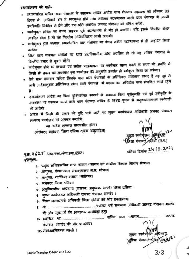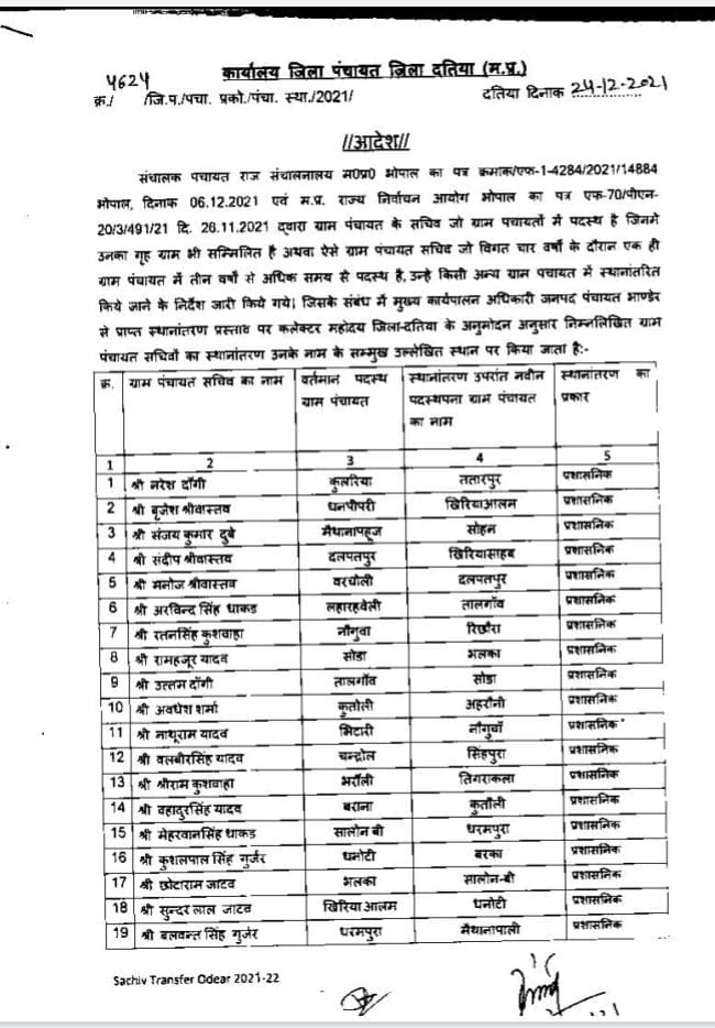 जिसके बाद निर्देशों के मुताबिक अब तक कई ग्राम पंचायत सचिवों को इधर से उधर किया जा चुका है। बड़ी सर्जरी दतिया जिले में हुई है। जहां मुख्य कार्यपालन अधिकारी जनपद पंचायत भांडेर से प्राप्त स्थानांतरण प्रस्ताव पर दतिया जिले के 49 पंचायत सचिवों को इधर से उधर किया गया है।