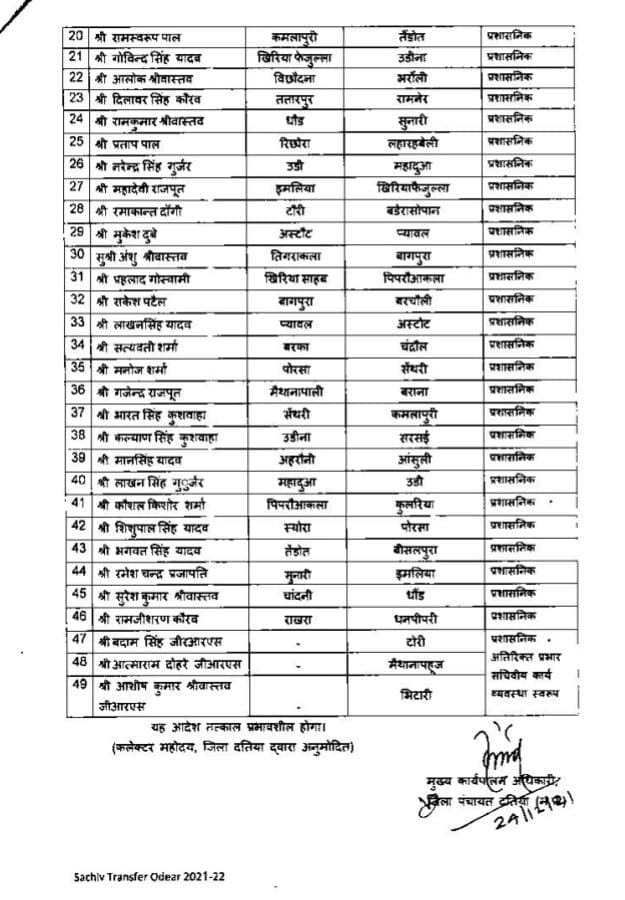 यह सभी 49 पंचायत सचिव विगत 4 वर्षों में 3 वर्षों से अधिक समय से एक ही जगह पर पदस्थ है जिसके बाद अब इन पर प्रशासनिक कार्रवाई करते हुए एंड पंचायत सचिवों को नवीन पदस्थापना सौंपी गई है। यहां देखे लिस्ट:-