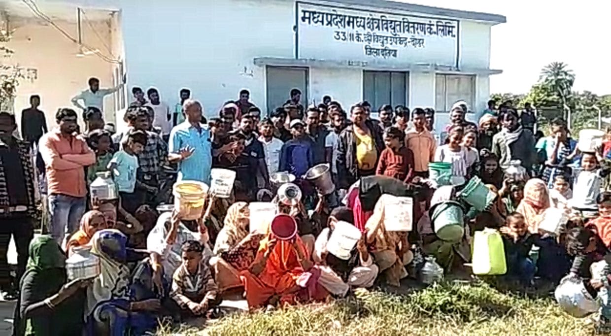 Datia News: दतिया जिले की तहसील इंदरगढ़ के अन्तर्गत आने वाले विद्युत विभाग के सब स्टेशन दोहर पर आज बिजली समस्या को लेकर ग्रामीणों ने धरना दिया है। महिलायें हाथों में खाली बर्तन लिए दफ्तर से आगे बैठी नजर आई है। वहीं लोगों ने सव स्टेशन दोहर का घेराव कर धरना प्रदर्शन किया और बिजली विभाग के खिलाफ मुर्दाबाद के नारे भी लगाए। हालांकि अब यह मामला शांत हो चुका है। लोगों द्वारा करीब चार घंटे प्रदर्शन करने के बाद इंदरगढ़ थाना प्रभारी परमानन्द शर्मा द्वारा ग्रामीणों को समझते को बिजली सप्लाई चालू कराकर मामला शांत करवाया गया।