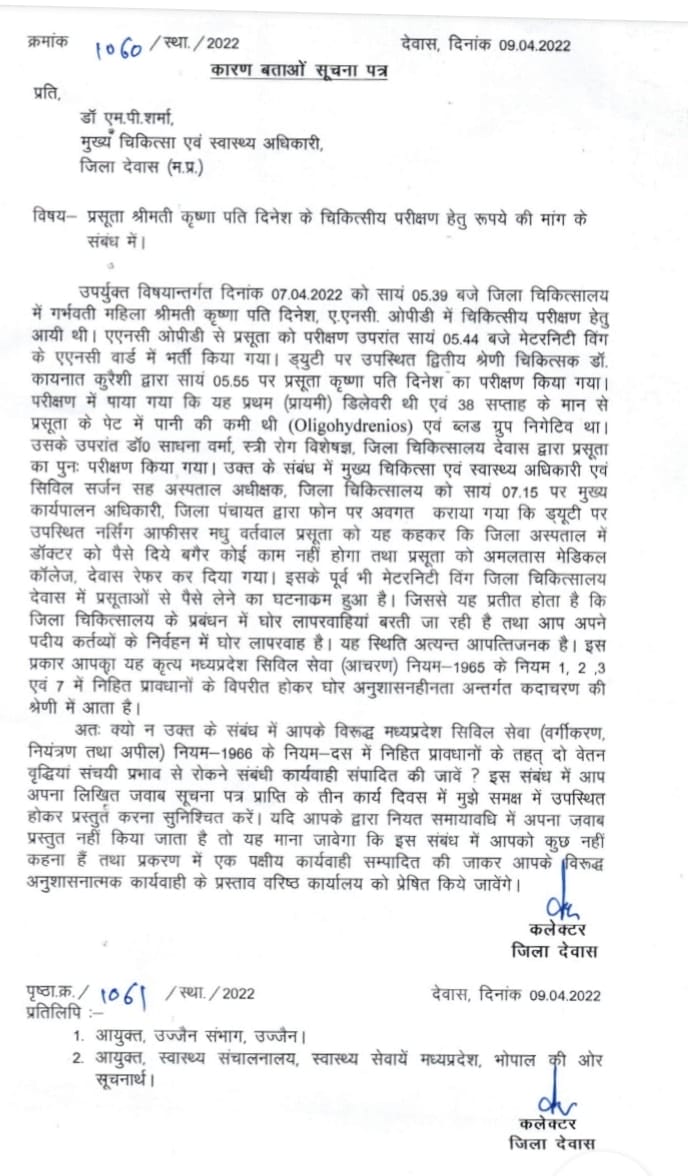 देवास कलेक्टर चंद्रमौली शुक्ला ने स्वास्थ्य कार्य में लापरवाही अनुशासनहीनता व लापरवाही बरतने पर सीएमएचओ डॉ एमपी शर्मा, सिविल सर्जन डॉ वी के सिंह, आरएमओ डॉ एमएस गोसर, डॉ शोभा राणा को कारण बताओ नोटिस जारी किए हैं। इसके साथ ही डॉ. साधना वर्मा के निलंबन के लिए प्रस्ताव आयुक्त उज्जैन को भेजा है। वही नर्सिंग ऑफिसर मधु वर्तवाल को निलंबित किया है ।