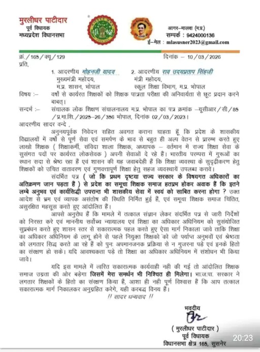 मुरलीधर पाटीदार ने अपने पत्र में कहा कि प्रदेश के शासकीय विद्यालयों में वर्षों से समर्पण भाव से अल्प वेतन पर काम कर रहे लाखों शिक्षक, जो पहले शिक्षाकर्मी और संविदा शिक्षक के रूप में नियुक्त हुए थे, शिक्षा व्यवस्था की रीढ़ हैं।
