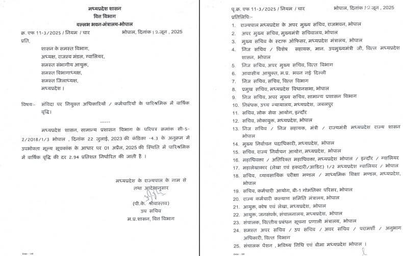 मध्य प्रदेश के डेढ़ लाख संविदा कर्मचारियों के लिए अच्छी खबर है। राज्य की मोहन यादव सरकार ने उपभोक्ता मूल्य सूचकांक के आधार पर 2.94 प्रतिशत वेतनवृद्धि की है। इस संबंध में वित्त विभाग ने भी आदेश जारी कर दिए है। नई दरें एक अप्रैल 2025 से लागू होंगी।
